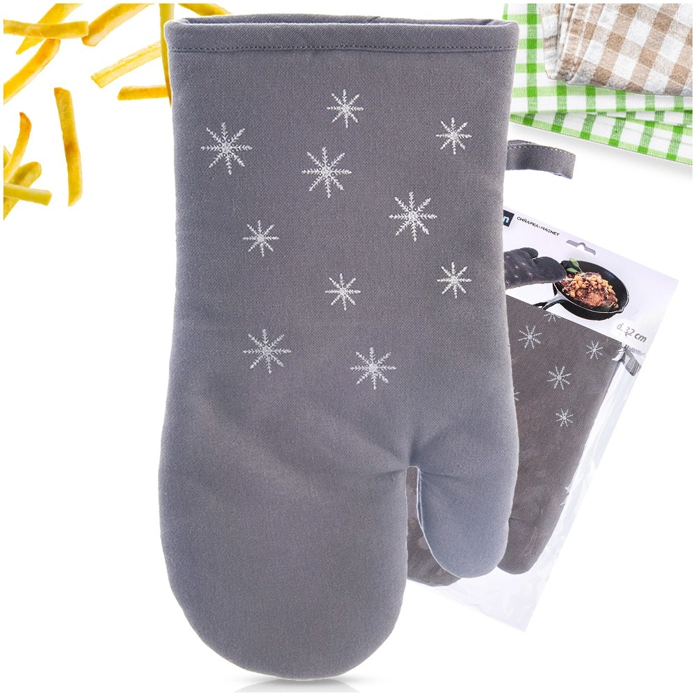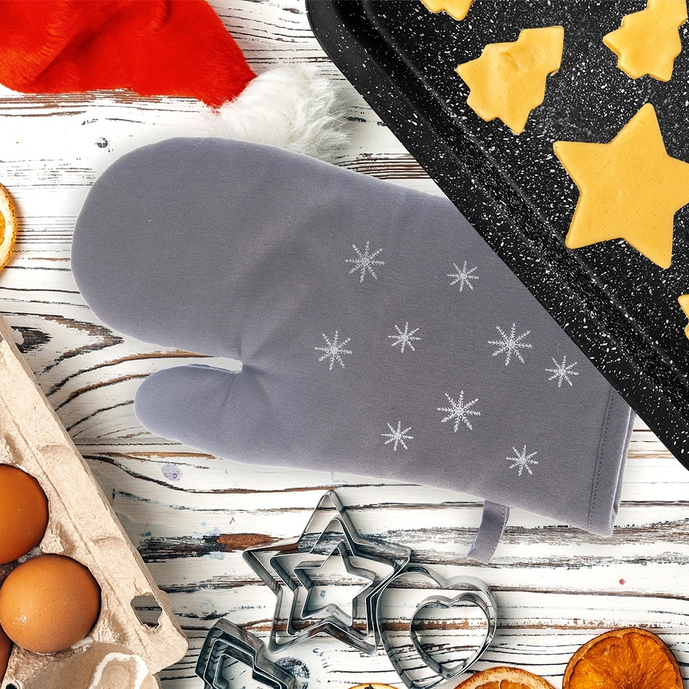Gant en coton stylé et fonctionnel avec un discret motif de flocons de neige, protégeant les mains lors de la manipulation de plaques chaudes, de vaisselle et de plats à four. Le rembourrage doux et la couverture complète de la main assurent une prise sûre et du confort au quotidien.