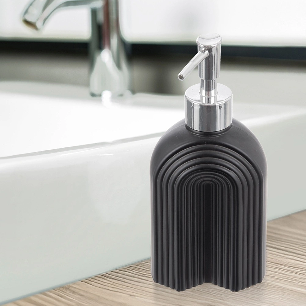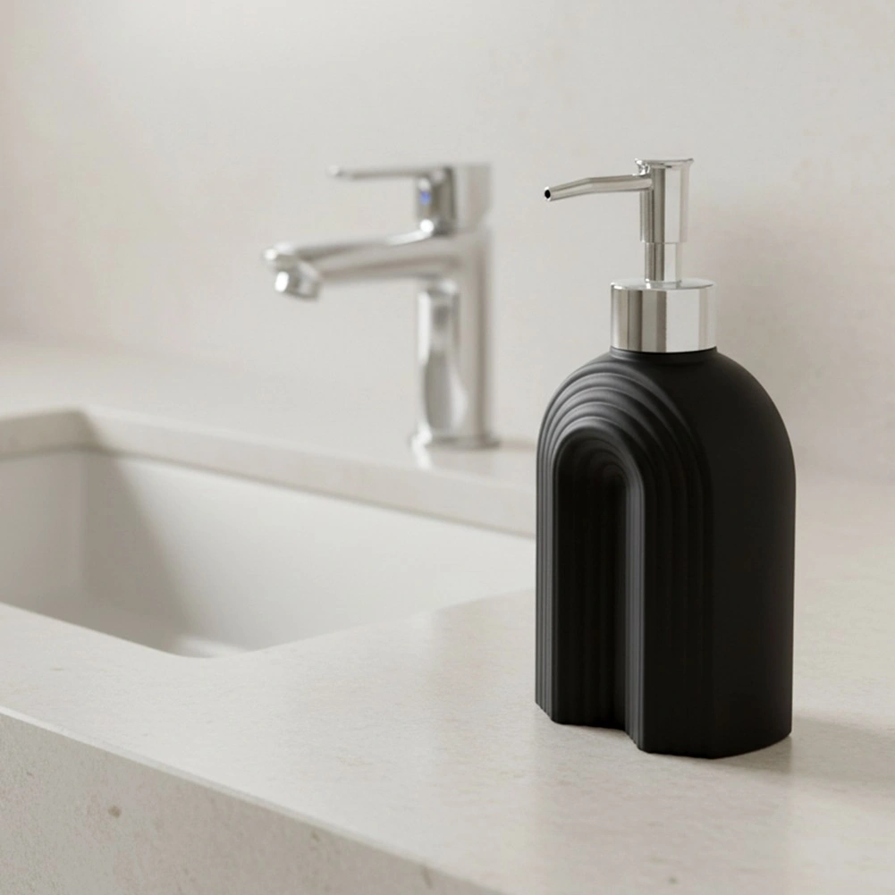 Distributeur stylé en verre de qualité, en noir mat, offrant une allure intemporelle et une utilisation pratique pour l’entretien quotidien de la maison. La forme arquée nervurée du flacon assure une prise ferme et sert d’élément décoratif, tandis que la pompe à l’aspect métallique brillant délivre le savon ou la crème avec précision et sans gaspillage.