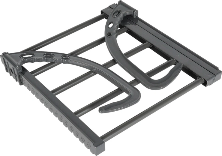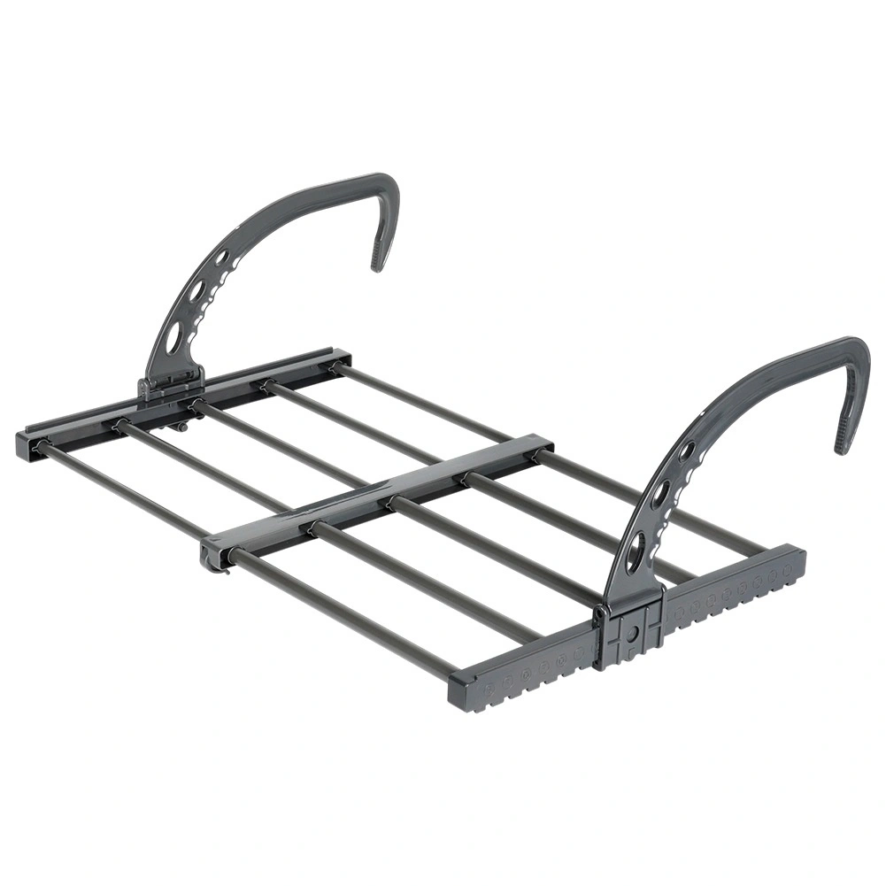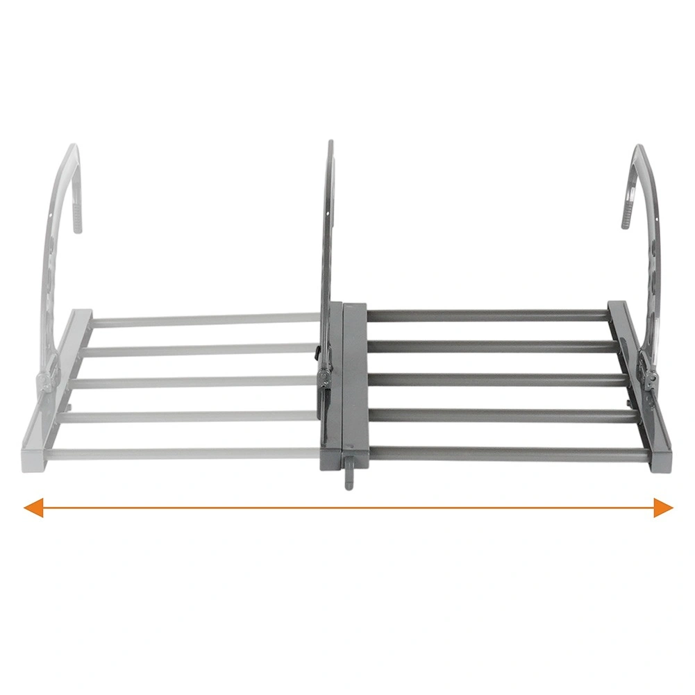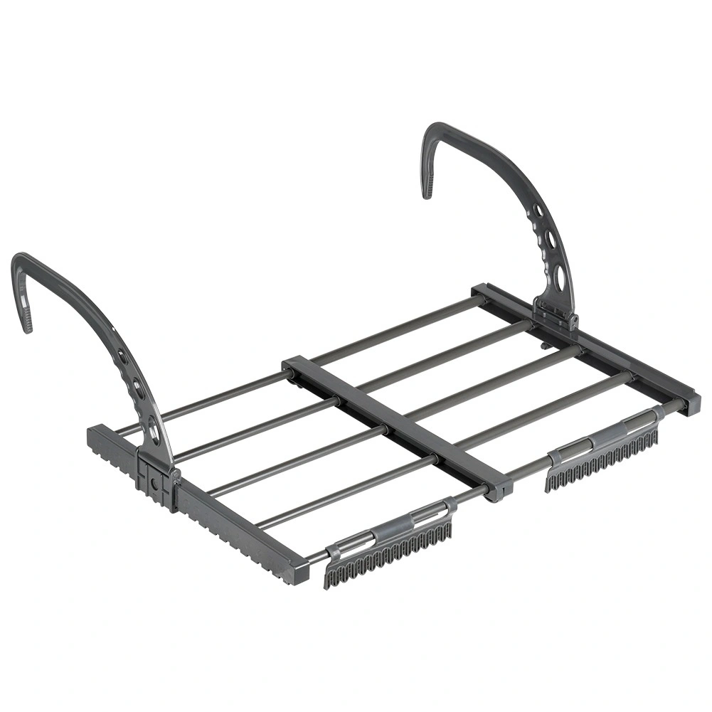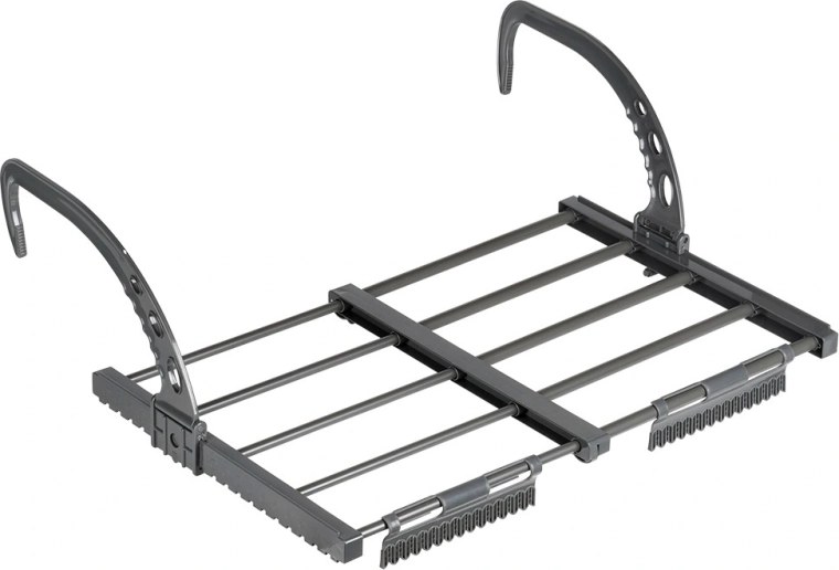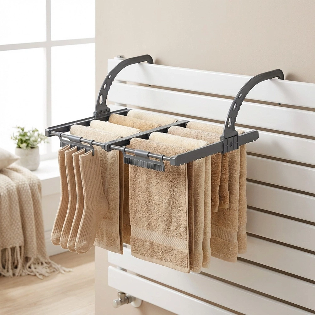 Compact, durable et polyvalent – il se suspend facilement à la plupart des radiateurs plats ou sèche-serviettes (profondeur max. 13 cm) sans perçage ni outils. Les bras réglables permettent un ajustement précis et une bonne stabilité, tandis que les barres métalliques grises garantissent une longue durée de vie et un entretien facile.