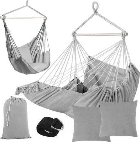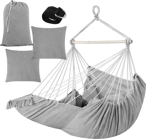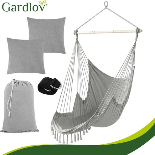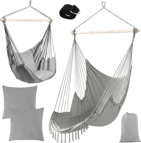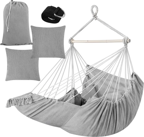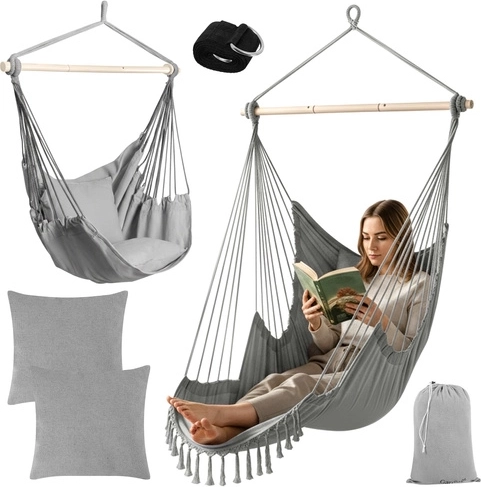 Profitez d’une détente paisible à la maison comme en plein air avec le fauteuil hamac suspendu GARDLOV au style soigné. Le tissu résistant, la barre de stabilisation et une capacité de charge de 150 kg assurent un balancement sûr et confortable. Le colis inclut 2 coussins moelleux, une sangle de suspension et une housse pratique pour un transport facile. Idéal pour le balcon, la terrasse, le jardin et le salon.