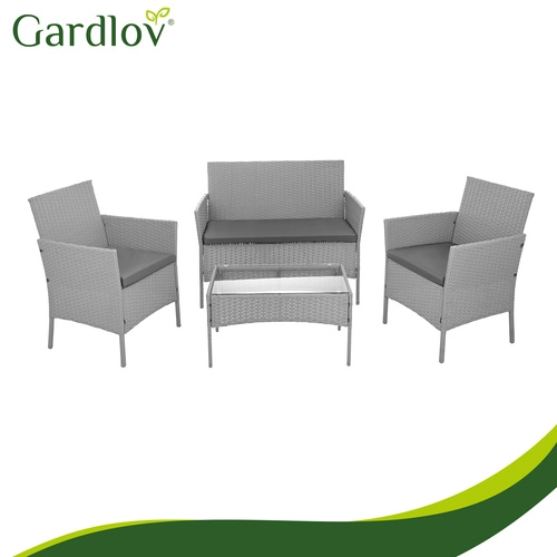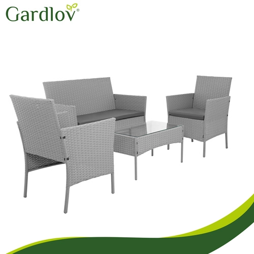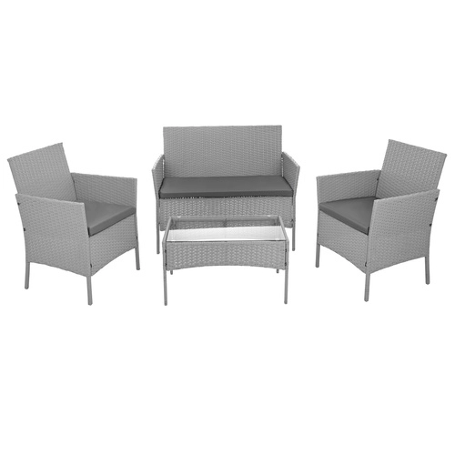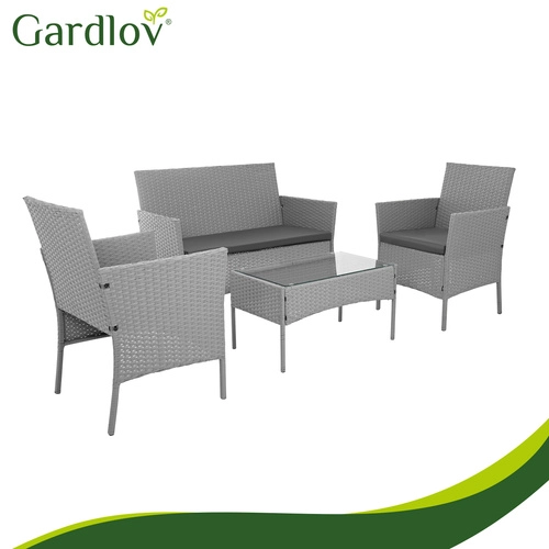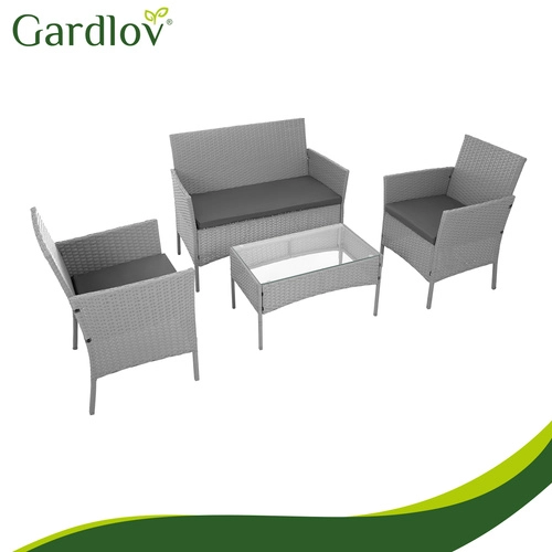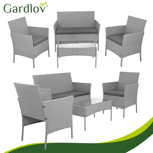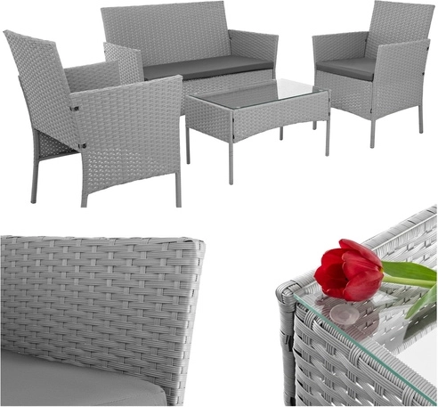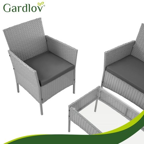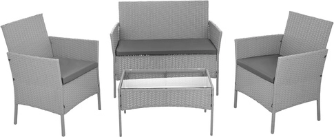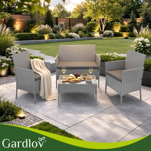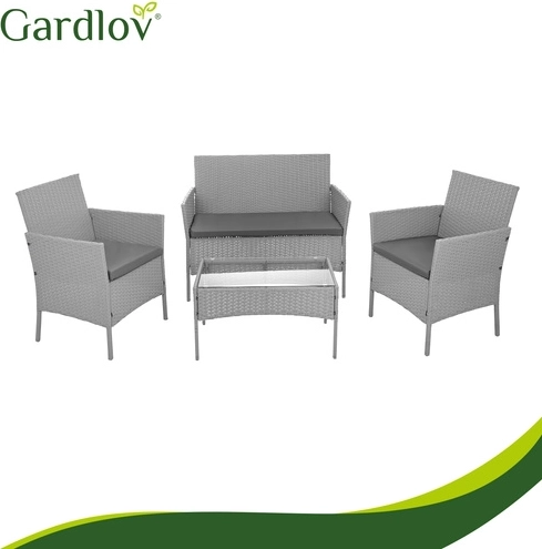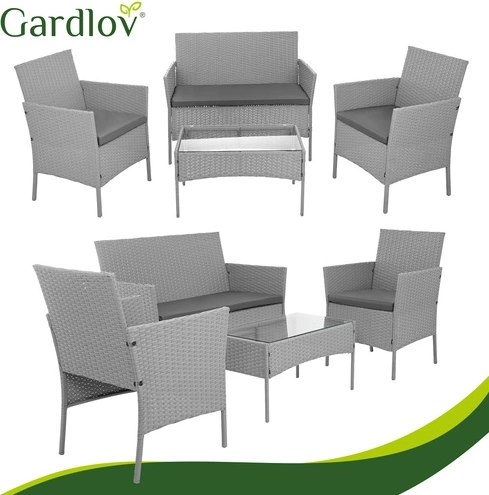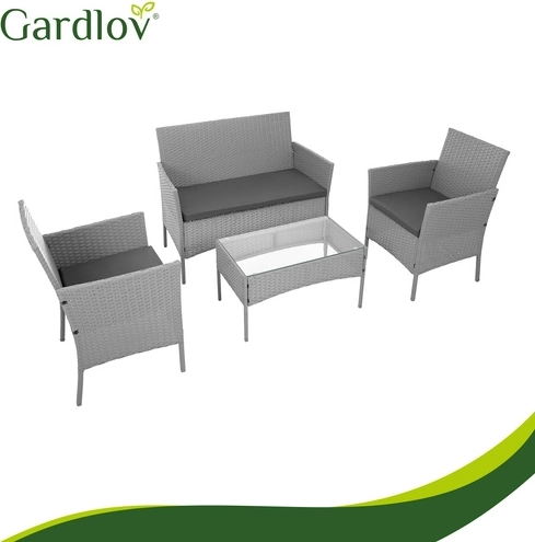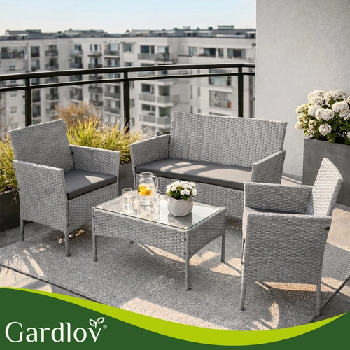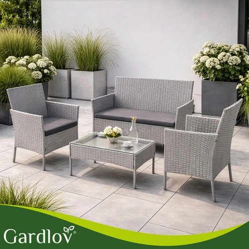 Élégant ensemble de jardin GARDLOV en gris apportant confort et style à la terrasse, au balcon et au jardin. 2 fauteuils, un canapé 2 places et une table basse avec plateau en verre trempé composent un set compact pour 4 personnes. Structure résistante en acier galvanisé tressé de résine (technorattan), imperméable et résistante aux UV, et entretien facile pour une longue durée de vie et une utilisation sans souci.