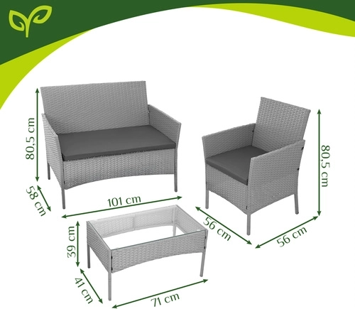 L’ensemble comprend des assises confortables de 5 cm d’épaisseur avec housses en polyester, lavables à 30 °C. La table basse avec plateau en verre de 5 mm apporte une touche moderne et s’avère pratique pour servir boissons et petits encas.