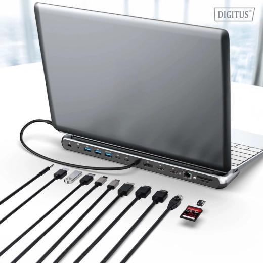 Connectez tout avec un seul câble et transformez votre ordinateur portable en un véritable poste de travail. Cette station d’accueil USB‑C à 12 ports offre une vidéo jusqu’à 8K/30 Hz, la prise en charge de jusqu’à trois moniteurs (MST), des ports rapides USB 3.2 Gen2 (10 Gb/s), Ethernet Gigabit, des lecteurs SD/microSD et une Power Delivery 100 W en passthrough pour l’alimentation de l’ordinateur portable. Des patins en caoutchouc et une base antidérapante assurent la stabilité sur le bureau.