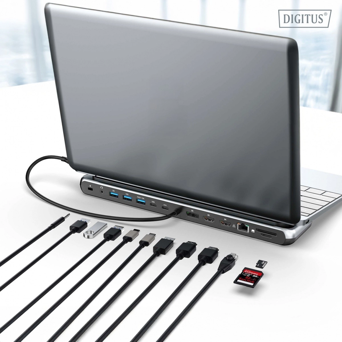Pour les transferts de données, profitez de USB‑C/USB‑A 3.2 Gen2 (10 Gb/s) et de USB‑A 3.2 Gen1 (5 Gb/s), deux ports prenant en charge en plus la charge 1,5 A pour les appareils mobiles. Un réseau stable est assuré par RJ45 Ethernet Gigabit, la gestion des médias par le lecteur SD/microSD (104 Mo/s) et l’audio 3,5 mm est au rendez‑vous. Via la USB‑C Power Delivery 100 W, alimentez simultanément l’ordinateur portable avec un seul câble.