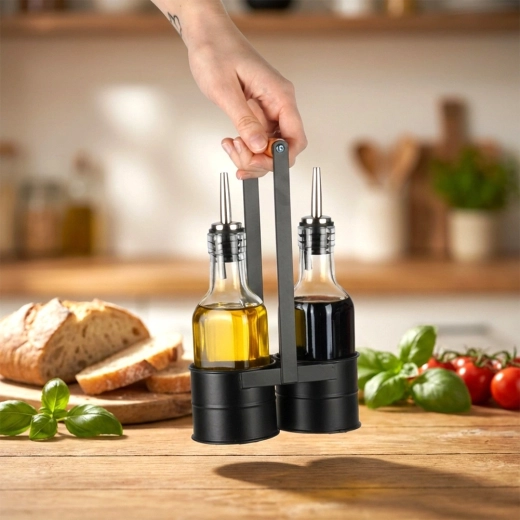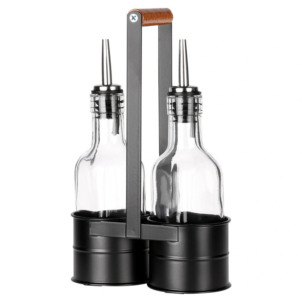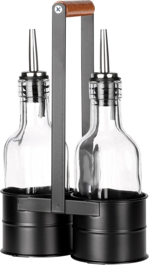 Ensemble pratique de deux bouteilles en verre pour huile et vinaigre dans un support métallique stable avec poignée en bois. Chaque bouteille a une capacité de 150 ml et est équipée d’un bec verseur en inox pour un dosage précis et propre. Le verre transparent permet un contrôle immédiat du contenu et le support noir élégant assure un transport facile et un service soigné à table.