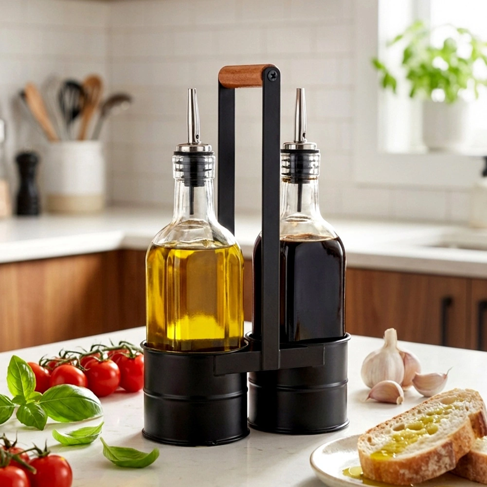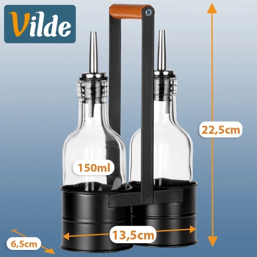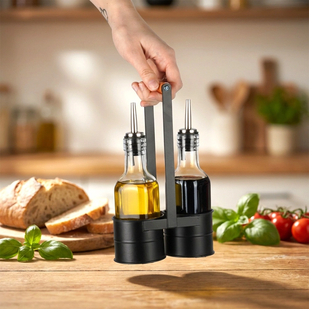 Ce set design de 2 bouteilles en verre clair est idéal pour le stockage et le service de l’huile d’olive et du vinaigre. Le support métallique noir avec poignée en bois confortable maintient les bouteilles en toute sécurité et facilite le transport dans la cuisine comme sur la table. Les becs verseurs en inox ralentissent l’écoulement et minimisent les gouttes, permettant un versement contrôlé et sans souci.