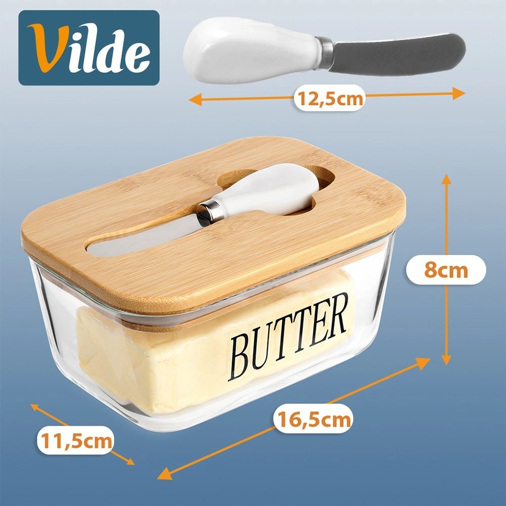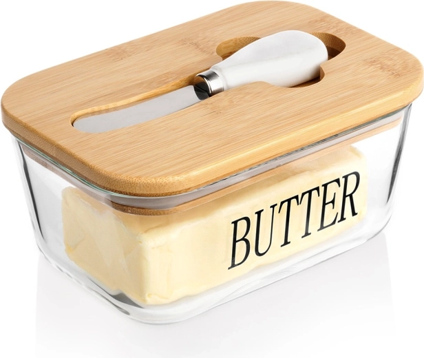 Beurrier élégant en verre avec couvercle en bambou et couteau à beurre intégré pour un rangement et un service pratiques. Verre transparent avec inscription BUTTER, capacité de 650 ml, dimensions 16,5 × 11,5 × 8 cm. La partie en verre passe au lave-vaisselle et convient au micro-ondes. Un accessoire stylé pour toute cuisine.