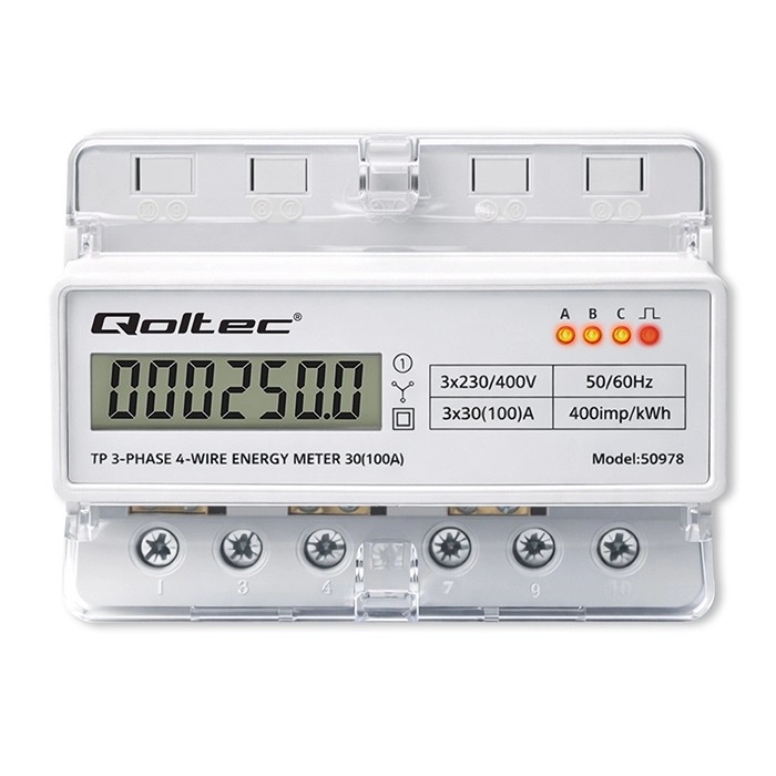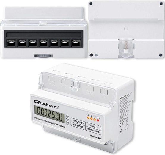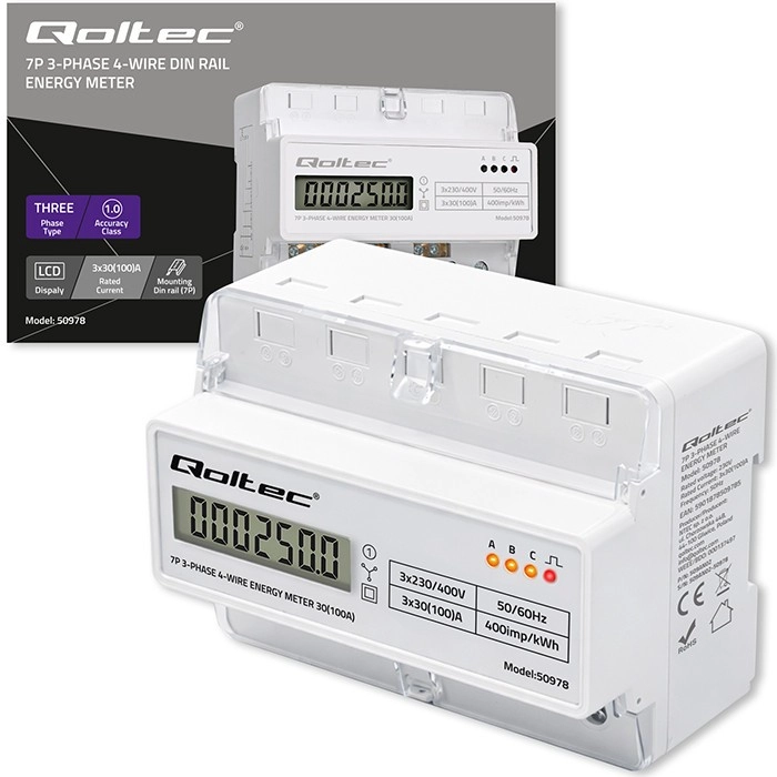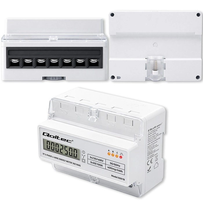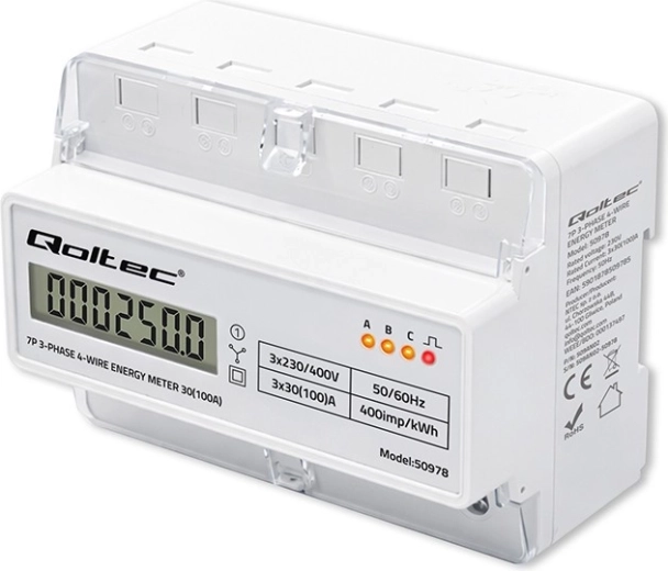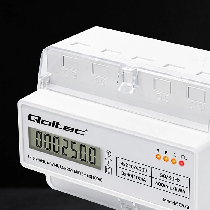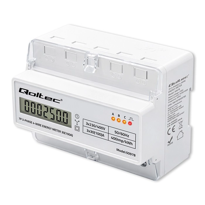 Le compteur Qoltec assure une mesure fiable de la consommation d’électricité pour des installations triphasées à quatre conducteurs, à une fréquence de 50/60 Hz. Grâce à l’écran LCD 6+1, vous lisez facilement les valeurs en kWh, tandis que la LED signale la consommation avec une constante de 400 imp/kWh. Le format compact et le montage sur rail DIN TH35 simplifient l’installation et la maintenance.
