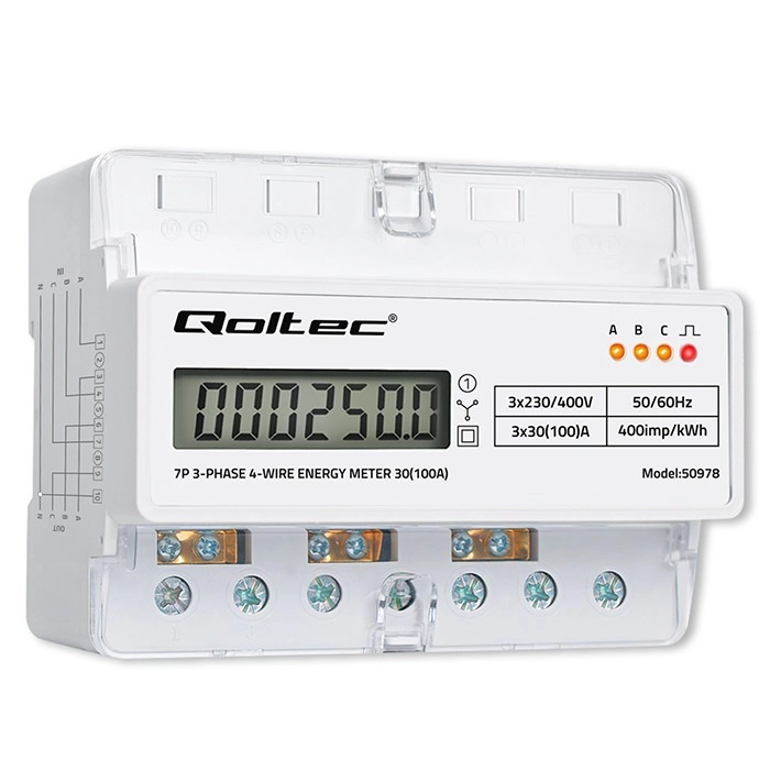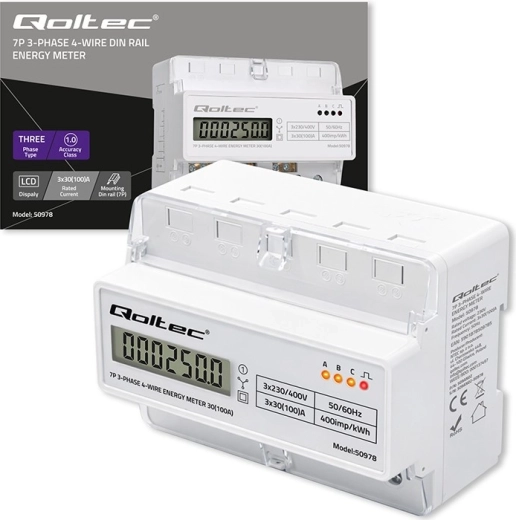 Le compteur triphasé Qoltec pour montage sur rail DIN permet un suivi précis et continu de la consommation d’énergie dans les réseaux 3×230/400 V. Il offre un affichage LCD lisible, une indication LED avec 400 imp/kWh et une installation aisée grâce à des dimensions compactes. Idéal pour les habitations et les tableaux industriels nécessitant un mesurage fiable en kWh et une classe de précision 1.0.