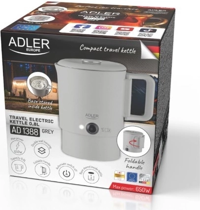 La bouilloire de voyage compacte ADLER AD 1388 d’une capacité de 0,8 l est idéale pour les vacances, les déplacements professionnels et le camping. Grâce à sa poignée rabattable, à la base rangée à l’intérieur de la bouilloire et à la double paroi, elle allie dimensions minimales à une ébullition de l’eau sûre et rapide. Son corps intérieur en acier inoxydable, l’arrêt automatique, la protection contre la chauffe à sec et la base rotative à 360° en font une compagne pratique pour chaque voyage.