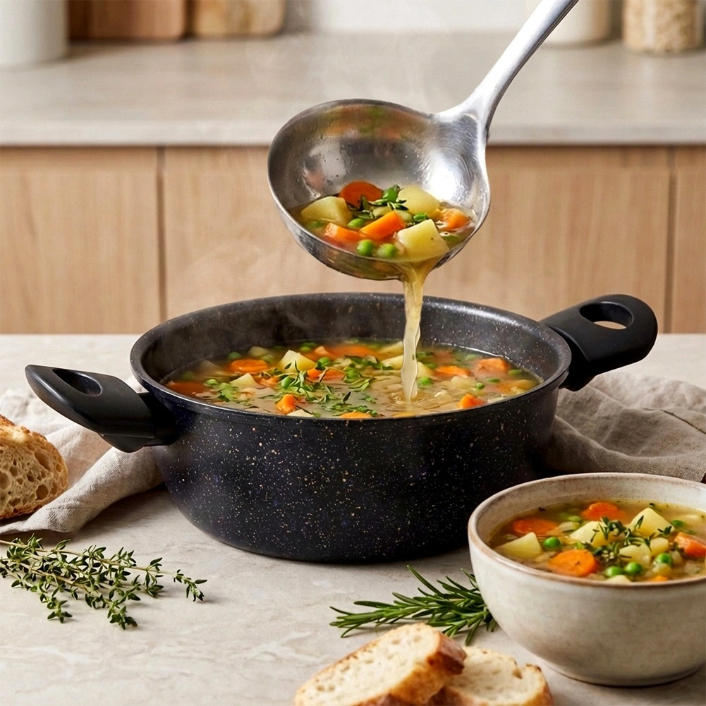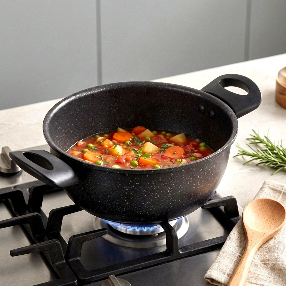 La couche en granit résistante empêche les aliments d’attacher et permet de préparer des plats avec un minimum de graisse. Le nettoyage est rapide et sans effort.