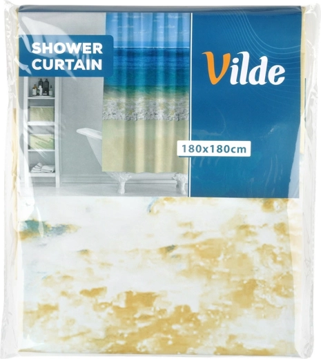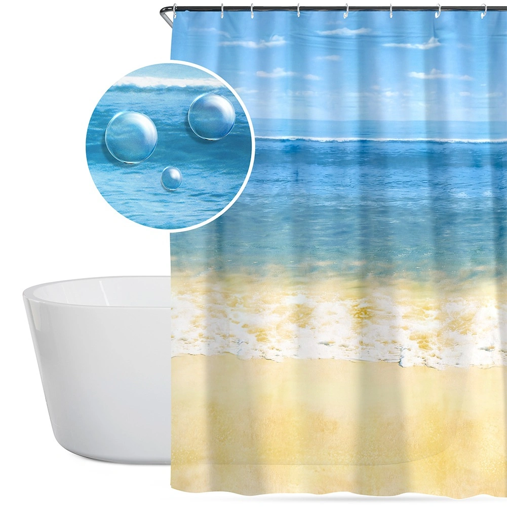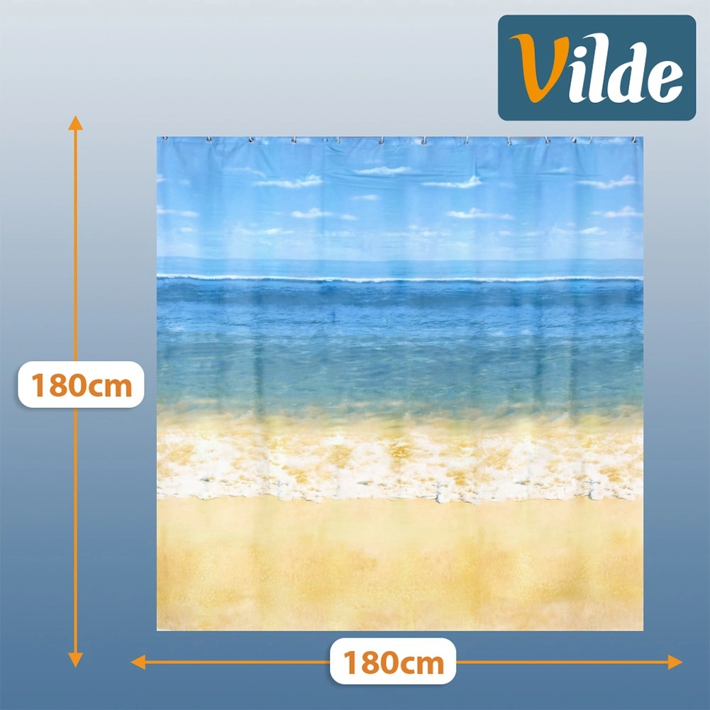 Rideau de douche élégant au motif de plage, dimensions 180 × 180 cm, livré avec 12 crochets. Fabriqué en matériau écologique PEVA, il est imperméable, facile à nettoyer et offre intimité et protection fiable contre les éclaboussures d’eau pour la plupart des baignoires et cabines de douche.