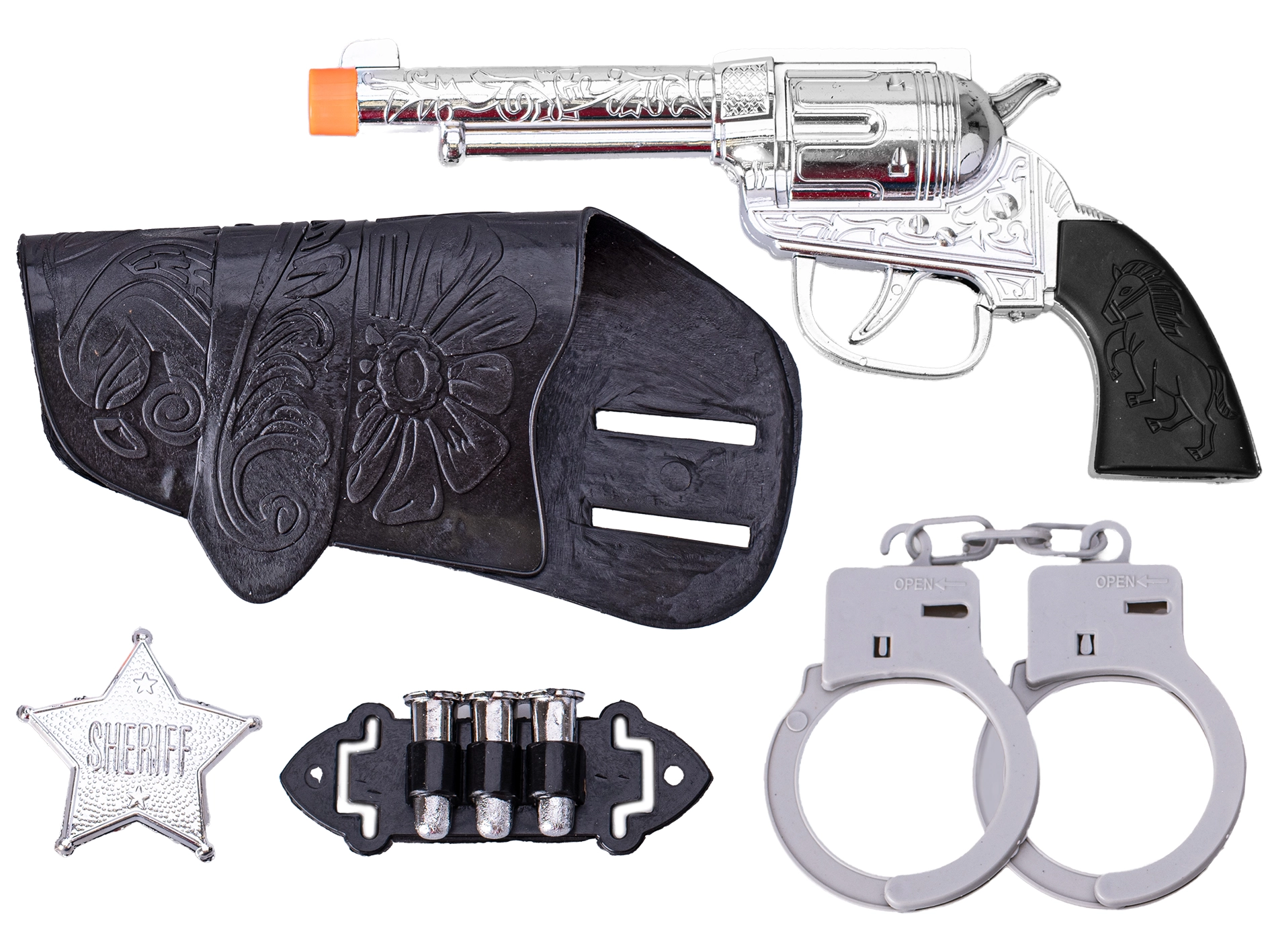 Donnez libre cours à l’imagination des enfants avec ce set western pour petits shérifs ! Le coffret comprend un revolver à amorces de 19 cm, un étui, des menottes et une étoile de shérif – idéal pour les jeux de rôle, le carnaval et les aventures à la maison. Grâce à sa construction en plastique légère et sûre, l’ensemble convient aux enfants à partir de 3 ans et constitue un excellent cadeau pour les jeunes passionnés du Far West.