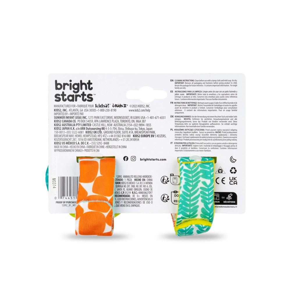 Les adorables jouets de poignet BRIGHT STARTS ravissent bébé à chaque mouvement. Chacun comporte un animal en peluche doux et un anneau de dentition sûr pour soulager lors de la poussée dentaire. Grâce à la fermeture réglable au poignet, ils restent toujours à portée de main, favorisent la motricité fine et offrent une stimulation sensorielle colorée dès la naissance.