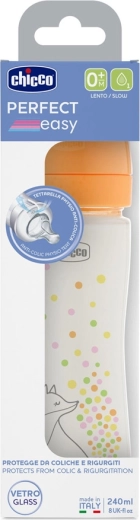 Le biberon en verre Chicco Perfect Easy est conçu pour le confort de bébé et des parents. Grâce à son débit lent, il favorise une tétée paisible, tandis que la valve anti-coliques minimise l’absorption d’air et donc le risque de coliques, de reflux et d’irritations. La tétine 100 % silicone de haute qualité est souple, résistante et imite la succion naturelle.