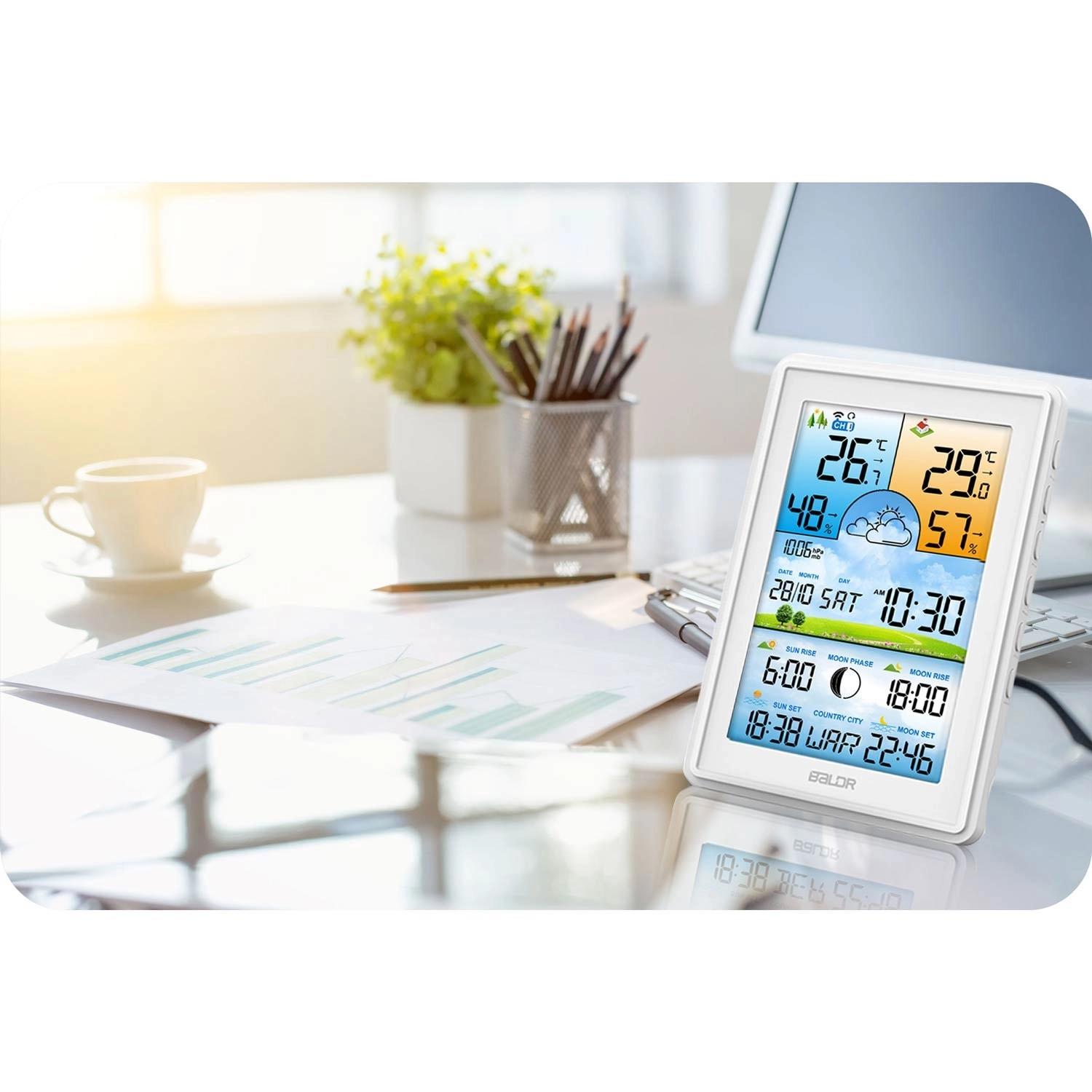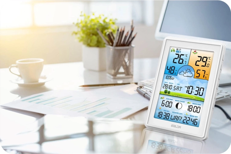 Station météo sans fil moderne avec écran LCD couleur et synchronisation automatique de l’heure DCF77, offrant une prévision sur 12–24 heures, une mesure précise de la température et de l’humidité à l’intérieur et à l’extérieur, un baromètre, les heures de lever/coucher du Soleil et de la Lune, les phases lunaires et une alarme. Grâce au rétroéclairage à quatre niveaux et à une interface claire, vous maintenez facilement un climat idéal à la maison comme au jardin.