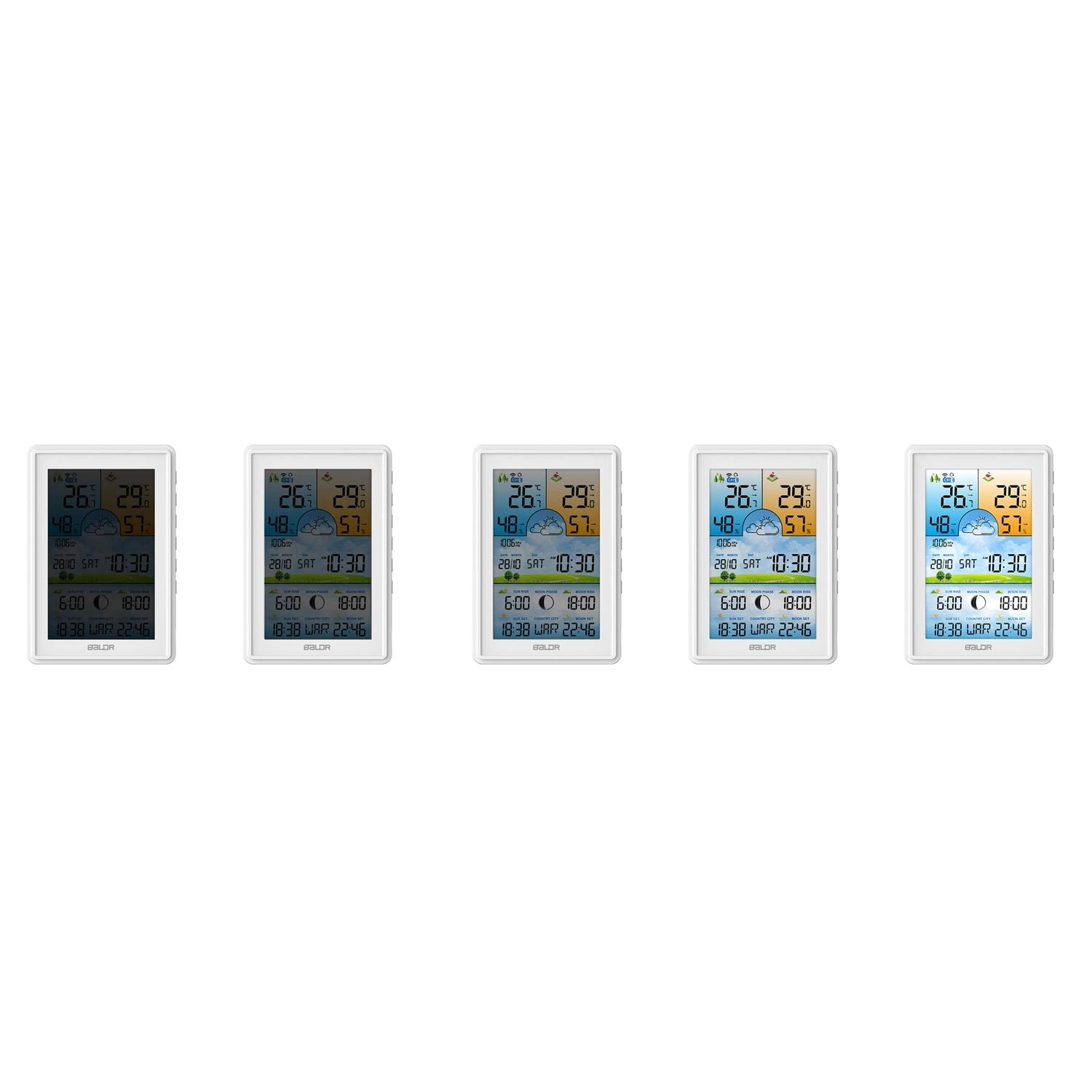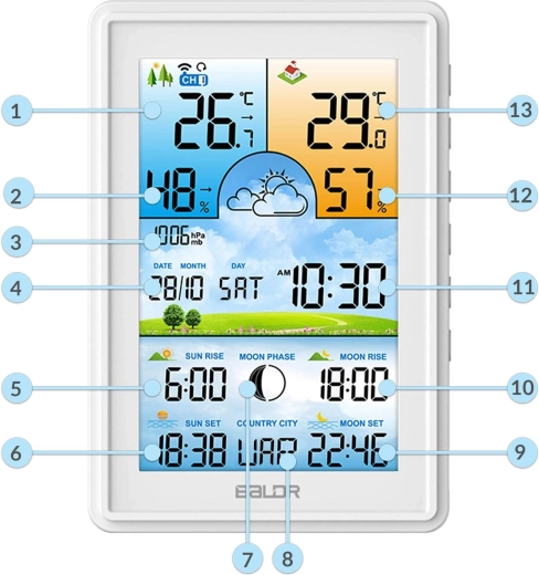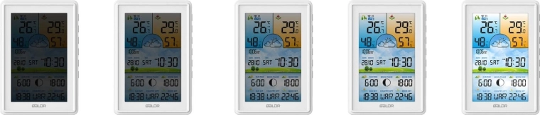 Le grand écran segmenté multicolore affiche simultanément la température et l’humidité intérieures et extérieures, l’heure, la date, les phases de la Lune et les icônes de prévision. Quatre niveaux de rétroéclairage pour une lecture confortable de jour comme de nuit.