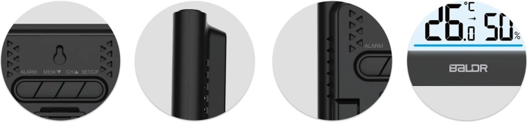 - Prévision météo, calendrier, alarme, mémoire min/max, indicateur de niveau de batterie, changement de canaux