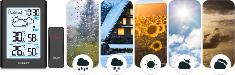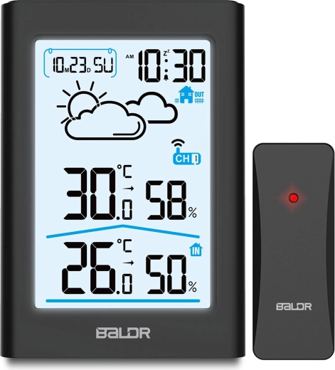 Pratique station météo numérique avec capteur sans fil pour l’intérieur et l’extérieur affichant clairement la température, l’humidité, l’heure 12/24 h, le calendrier et des icônes de prévision météo. Elle offre une mémoire des min/max, un LCD rétroéclairé, un indicateur de niveau de batterie et une portée du capteur jusqu’à 60 m – idéale pour la maison et le bureau.