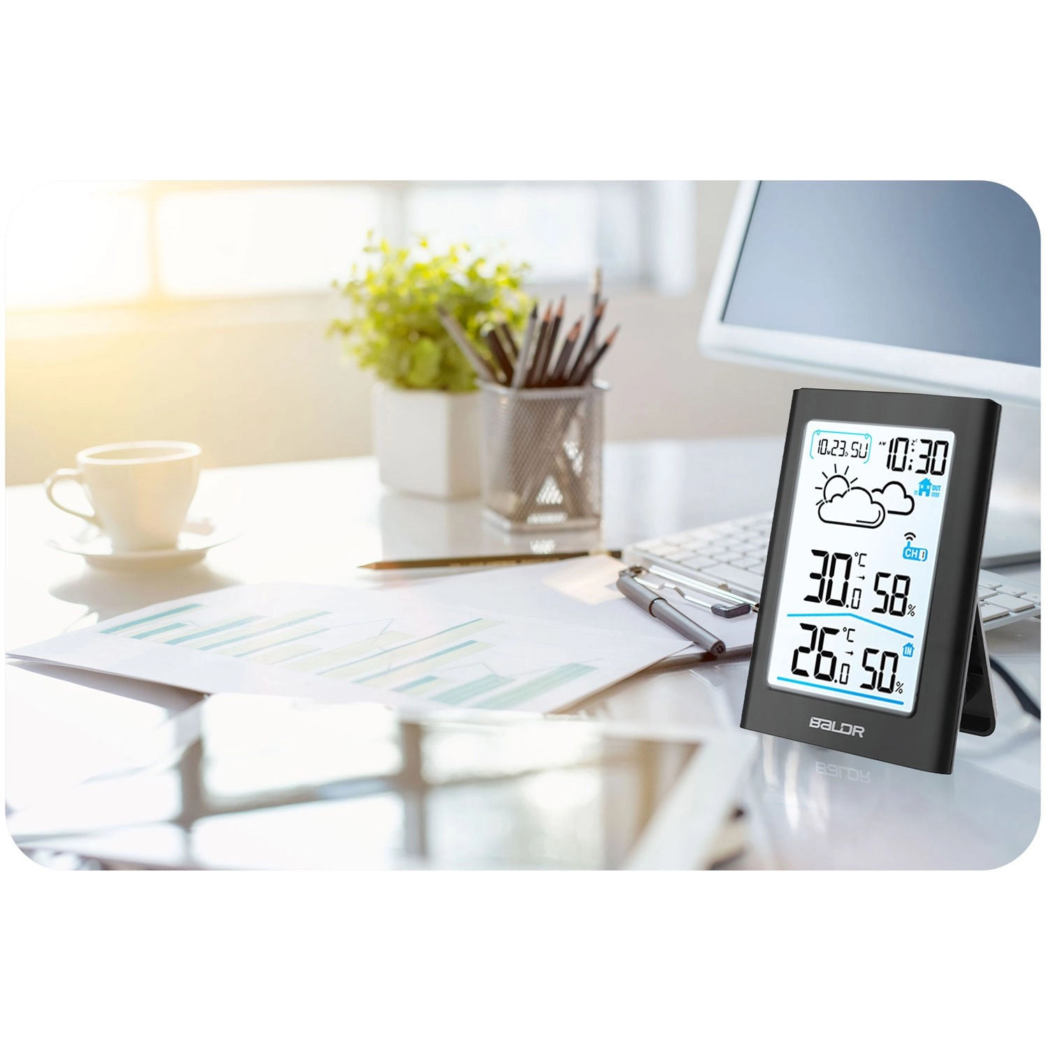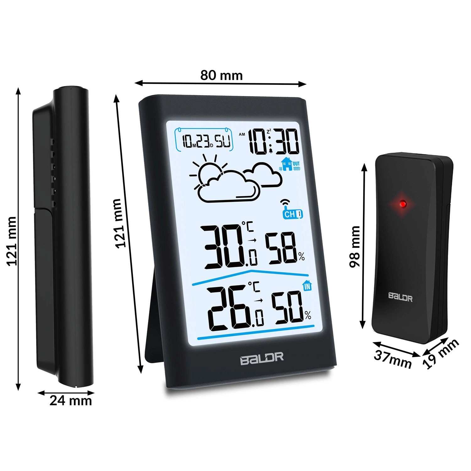 Le capteur sans fil avec une portée allant jusqu’à 60 m s’appaire automatiquement avec la station et prend en charge le changement de canaux pour ajouter d’autres capteurs. Commandes intuitives, grands chiffres lisibles et design élégant noir s’intègrent à tout intérieur – sur une table ou au mur. Le rétroéclairage jour/nuit commutable assure une lecture confortable en toutes conditions.