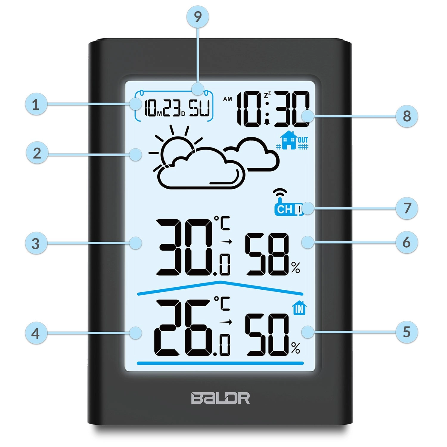 De grands chiffres faciles à lire affichent l’heure, la date, la température et l’humidité en intérieur comme en extérieur. Le rétroéclairage permet une lecture aisée de jour comme de nuit.