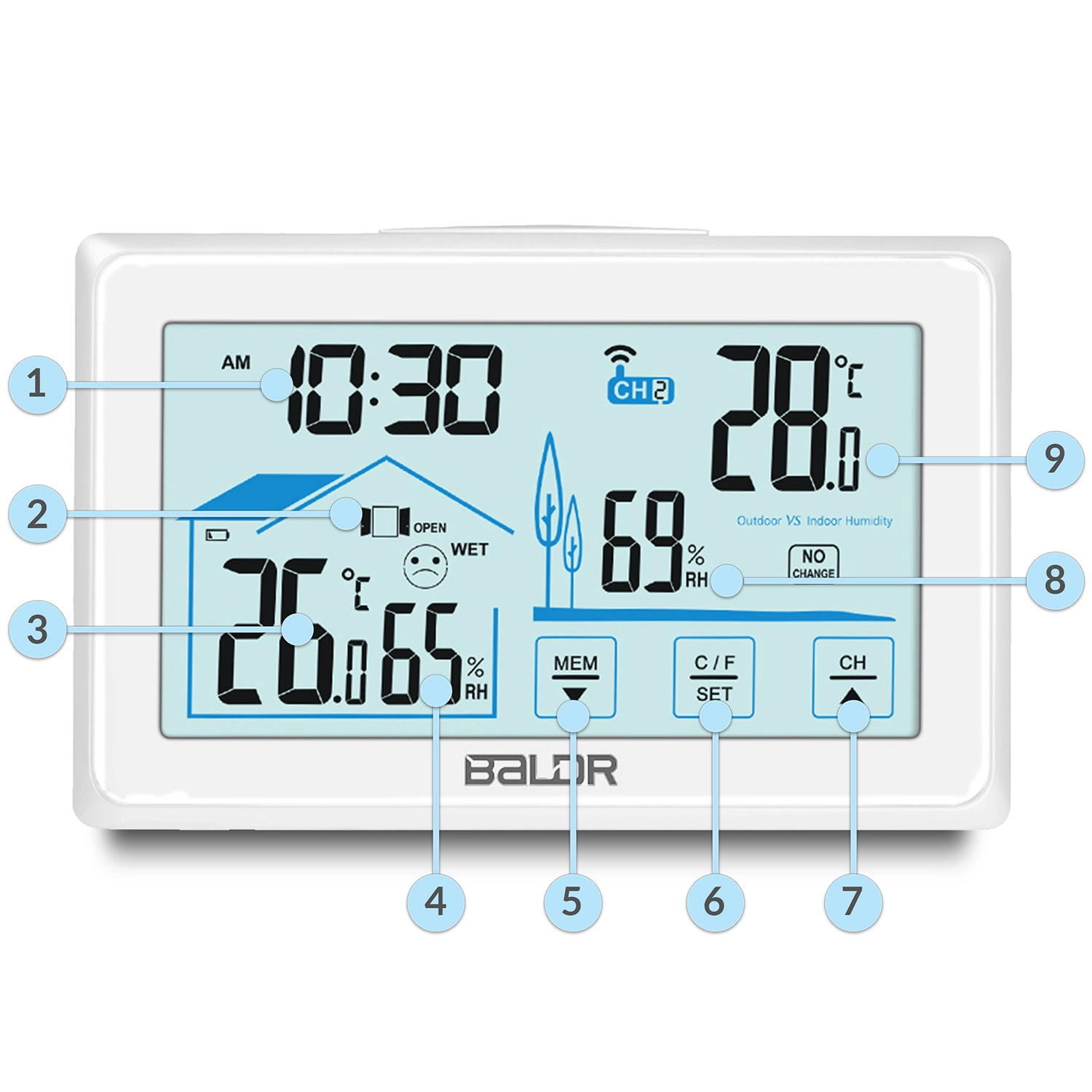 Grâce à la mémoire min./max., détectez rapidement les variations climatiques. Des fonctions intégrées telles que l’heure 12/24 h, le basculement °C/°F et l’alerte “ouvrir/fermer la fenêtre” facilitent l’aération intelligente et les économies d’énergie. De grands chiffres et un rétroéclairage simplifient la lecture de jour comme de nuit.