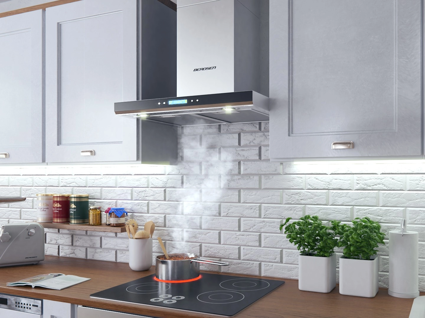 La hotte propose 3 vitesses, un débit maximal de 335 m3/h et un éclairage LED 2 × 1 W pour illuminer clairement la zone de cuisson. Les commandes tactiles avec affichage assurent un grand confort d’utilisation, et les caches de cheminée télescopiques permettent un raccordement d’extraction net. Elle peut fonctionner en évacuation ou en recyclage avec le filtre à charbon BERDSEN TYPE‑E en option.