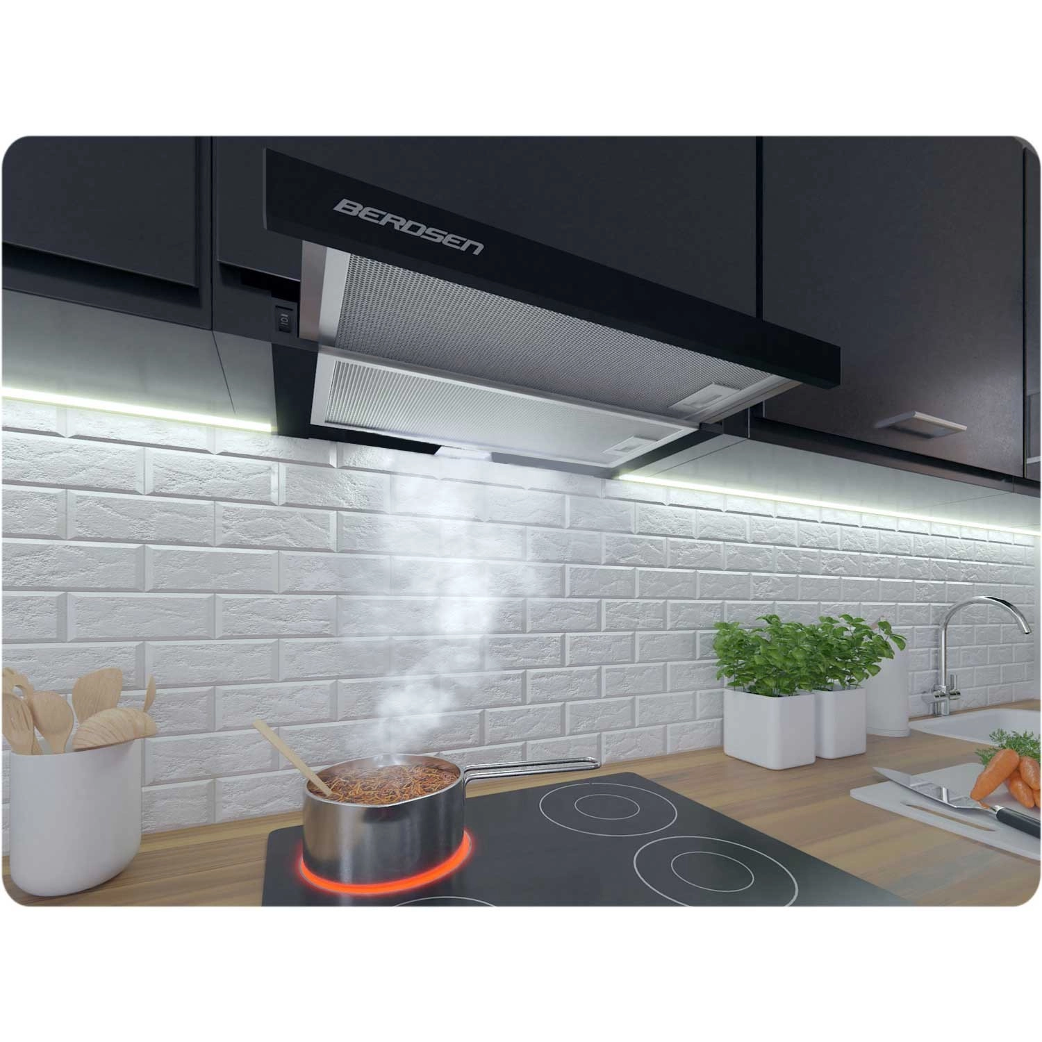 La hotte télescopique encastrable élégante BERDSEN élimine efficacement vapeur, odeurs et graisses à la source. Grâce à la lisse coulissante, vous obtenez une plus grande surface d’aspiration et une meilleure efficacité, tandis que le corps compact reste dissimulé dans le meuble. Vous apprécierez aussi l’éclairage LED 2 W économe, qui illumine parfaitement la table de cuisson.
