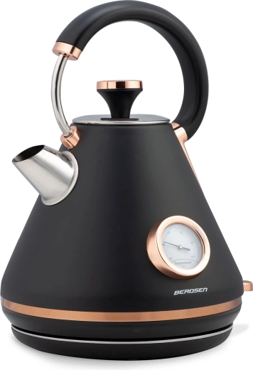 Bouilloire rétro élégante Berdsen 1,7 l avec thermomètre analogique intégré pour une préparation précise du thé et du café. Elle offre un corps métallique à finition mate, une base rotative à 360°, un interrupteur rétroéclairé, une poignée qui ne chauffe pas et un filtre anti‑calcaire amovible pour une eau plus propre. Un couvercle amovible, un indicateur de niveau d’eau et des pieds antidérapants assurent une utilisation confortable et sûre.