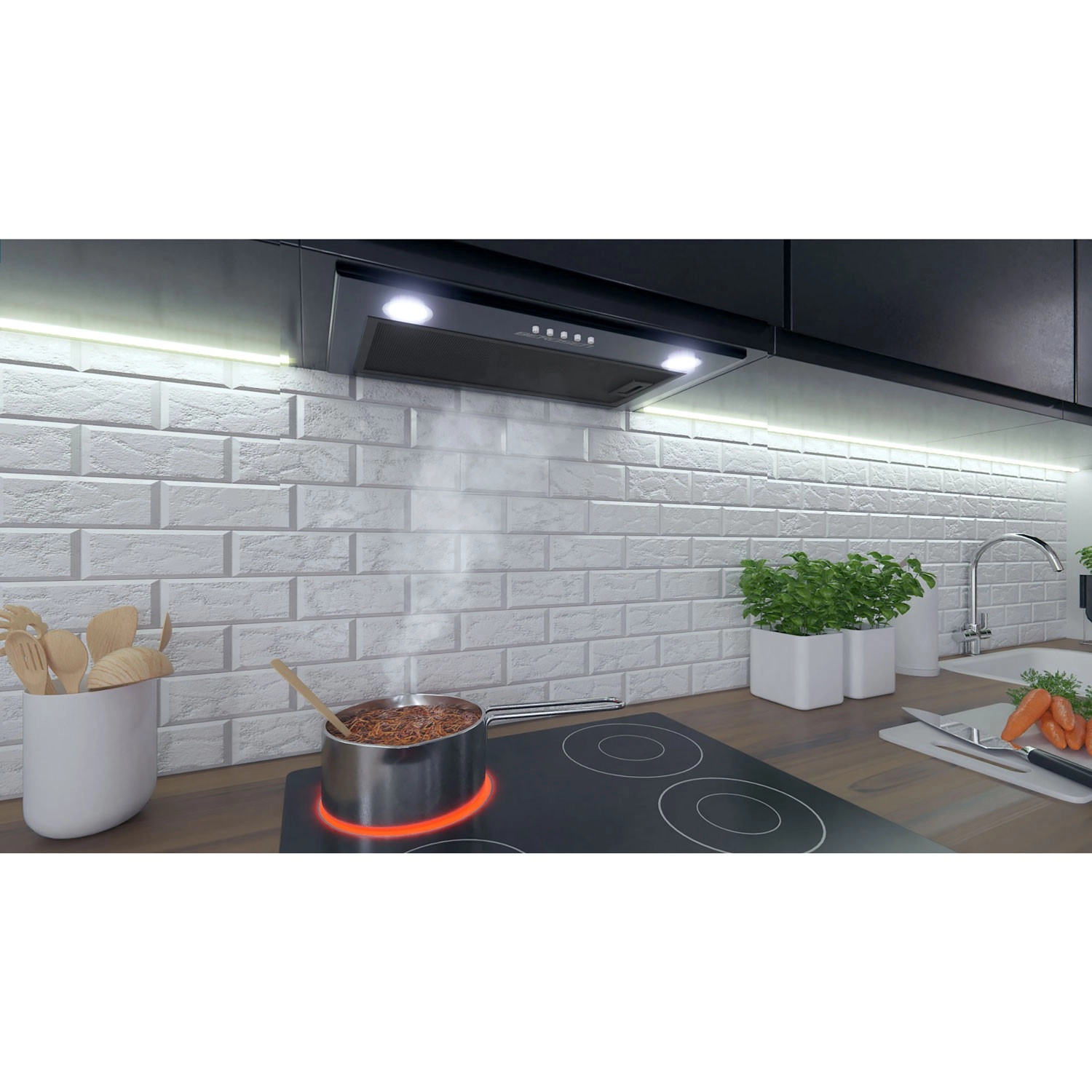 La hotte encastrable sous-meuble Berdsen en noir devient un élément discret mais performant de votre cuisine. Avec une capacité d’aspiration maximale jusqu’à 380 m³/h, elle gère vapeur et graisses afin d’éviter les dépôts sur meubles et crédence. Deux sources LED (2 × 2 W) offrent un éclairage agréable et économe au-dessus du plan de travail.