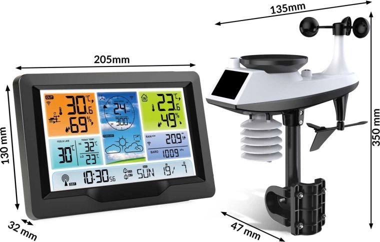 - Alimentation flexible : adaptateur secteur pour la console, piles AA pour les capteurs, alimentation assistée par solaire pour l’unité extérieure.