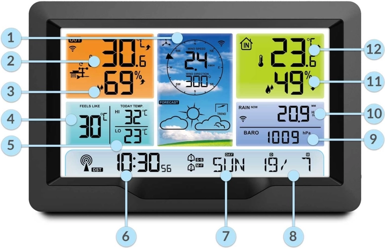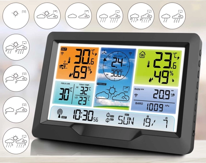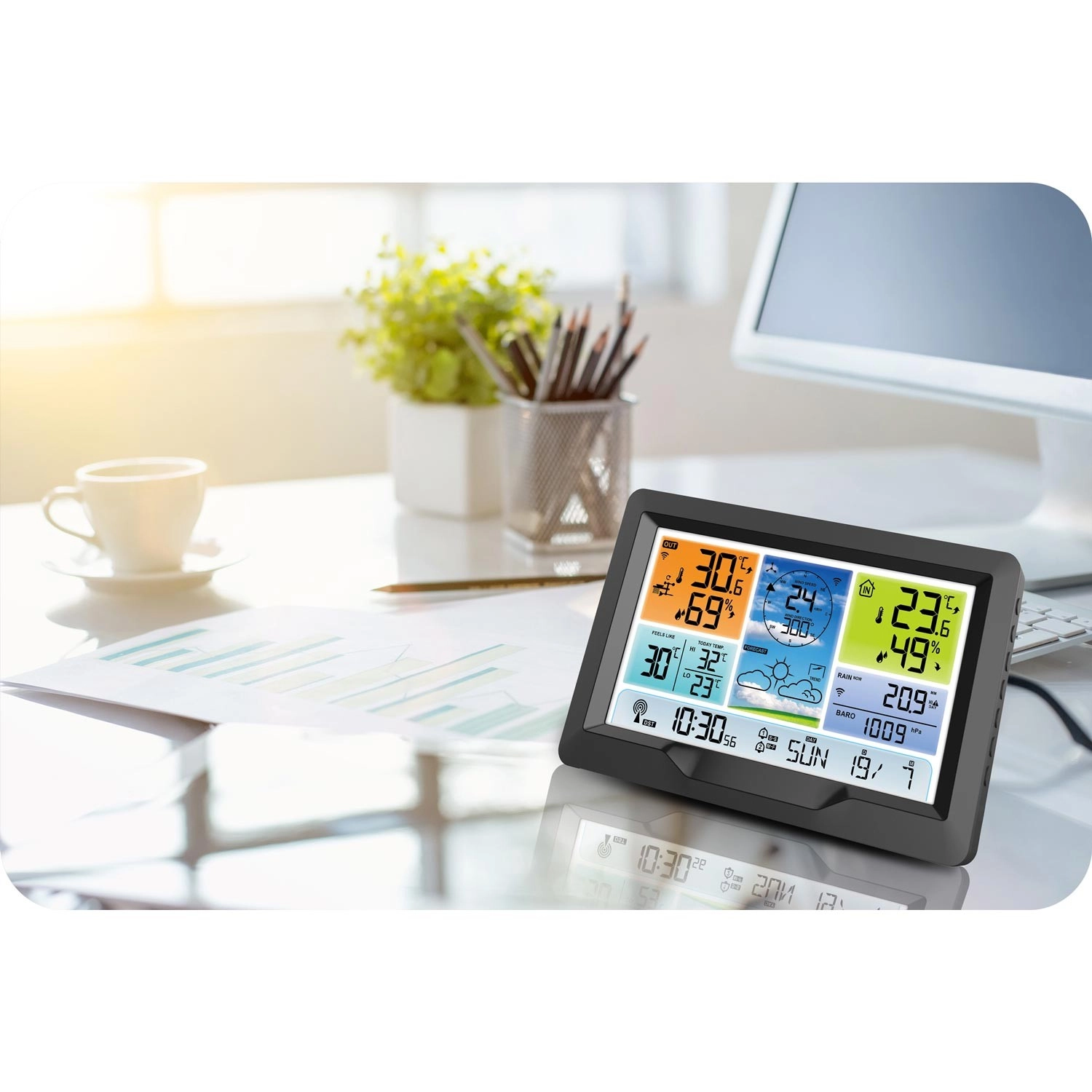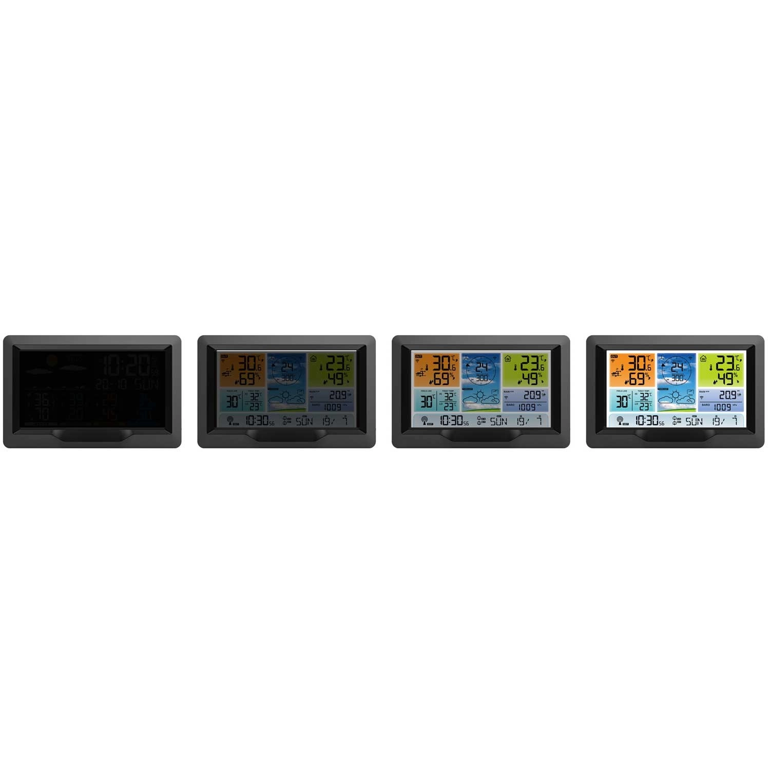 Pour plus de confort, on trouve une alarme avec fonction snooze, un calendrier jusqu’en 2099, le DCF77 pour le réglage automatique de l’heure et des alarmes de température extérieure haute/basse avec alerte gel. L’écran couleur LCD offre 3 niveaux de rétroéclairage (100 % / 50 % / 10 %) ou une extinction totale. La station prend en charge une connexion sans fil du capteur jusqu’à 100 m et la possibilité d’alimentation solaire pour le module extérieur.