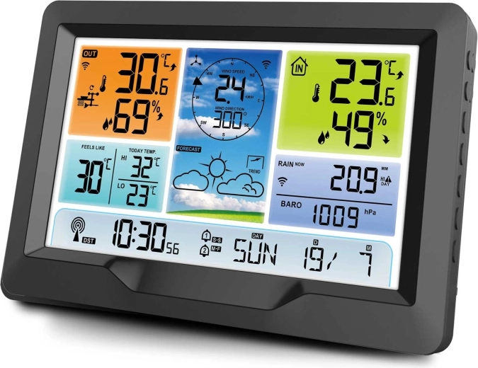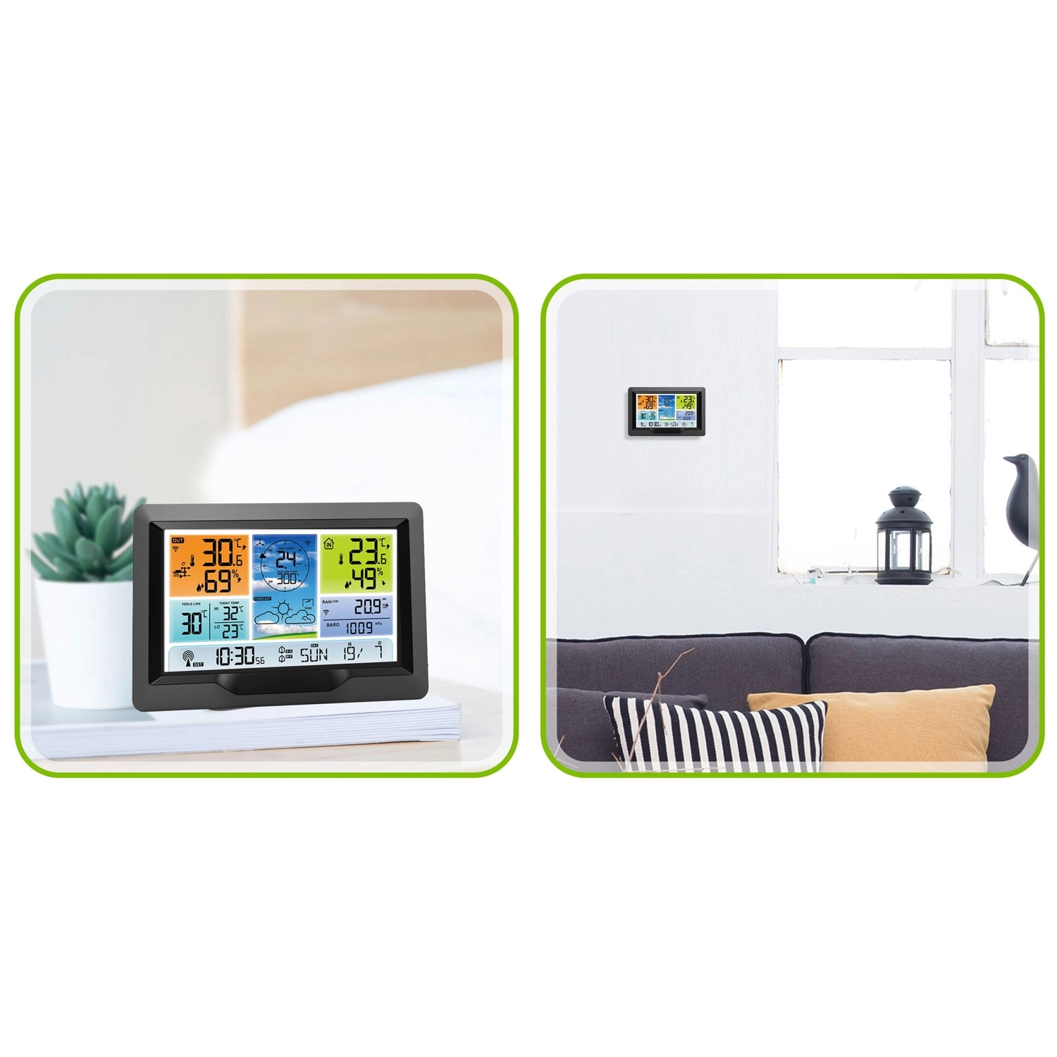 Station météo sans fil moderne avec écran LCD couleur, synchronisation de l’heure via le signal DCF77 et puissant capteur extérieur multisensor offrant une prévision sur 12 heures, la mesure de la température, de l’humidité, de la pression, du vent et des précipitations. Propose des alarmes de température, une mémoire MIN/MAX, un indicateur de température ressentie, un calendrier, une alarme avec répétition – snooze et un rétroéclairage à trois niveaux. Portée sans fil du capteur jusqu’à 100 m et possibilité d’alimentation solaire pour un suivi quotidien facilité de la météo.