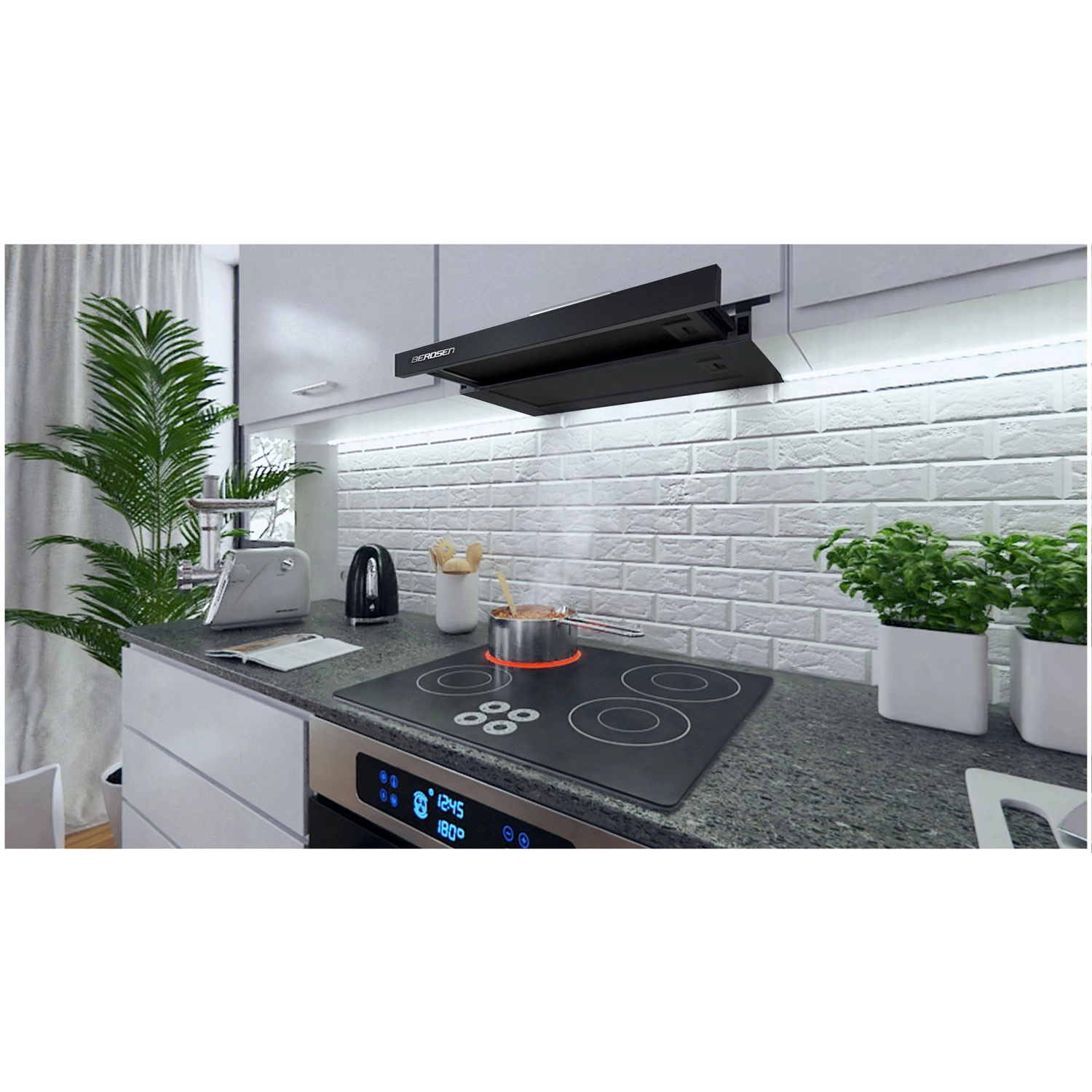 Cette hotte télescopique (coulissante) est un excellent choix pour les cuisines modernes et minimalistes où chaque centimètre compte. Elle se dissimule discrètement dans le meuble et, une fois le panneau avant déployé, augmente la surface d’aspiration pour capturer plus efficacement vapeurs et odeurs directement au-dessus de la table de cuisson. Son éclairage LED économe améliore la visibilité sur casseroles et poêles tout en économisant l’énergie.