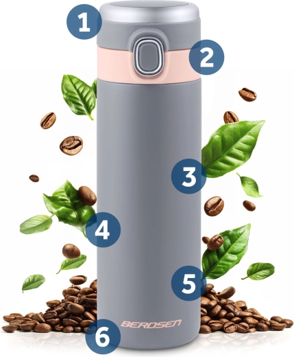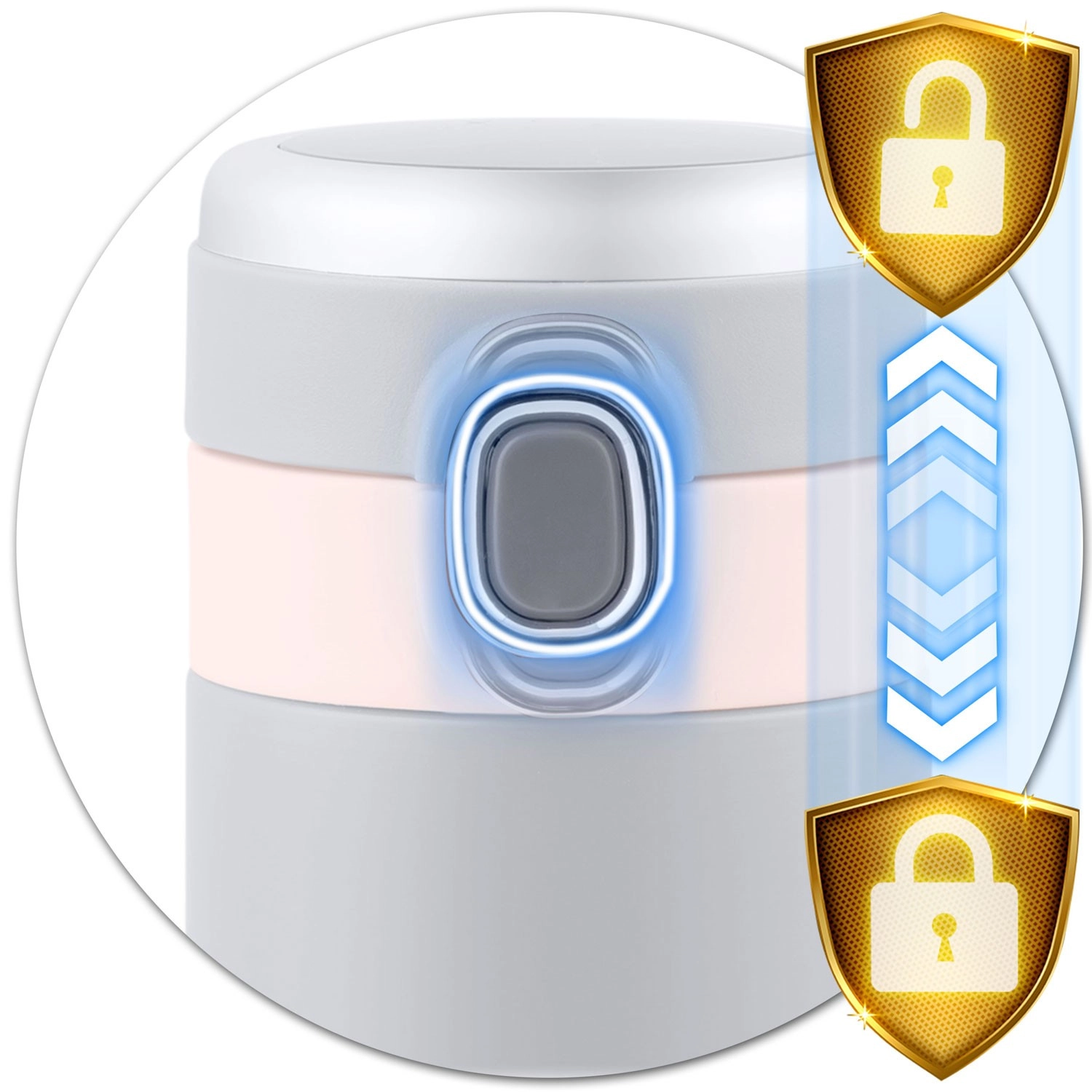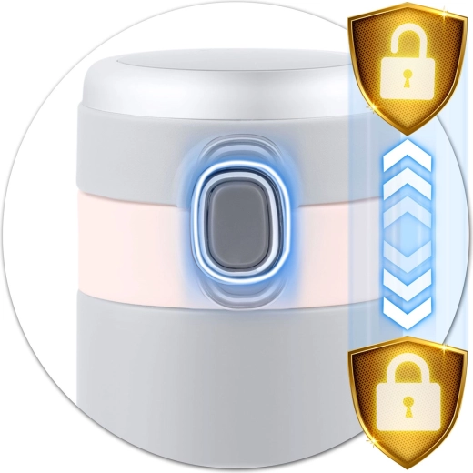Des détails bien pensés, comme le verrou du couvercle contre les ouvertures involontaires, l’ouverture à une main par bouton et le socle amortisseur contre les chocs bruyants, améliorent le confort et la longévité du produit. Le thermos est 100 % étanche, facile à transporter et s’adapte parfaitement à la plupart des porte-gobelets.