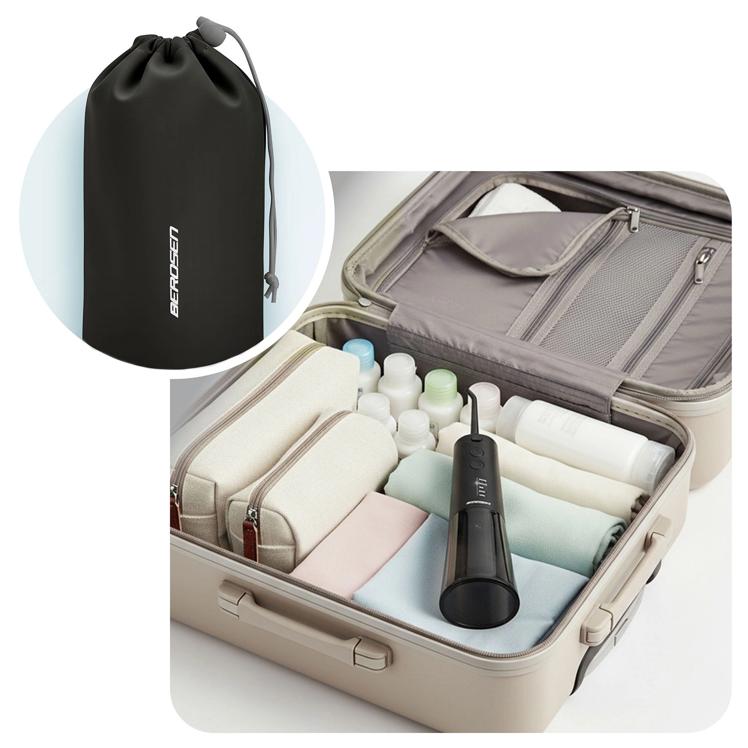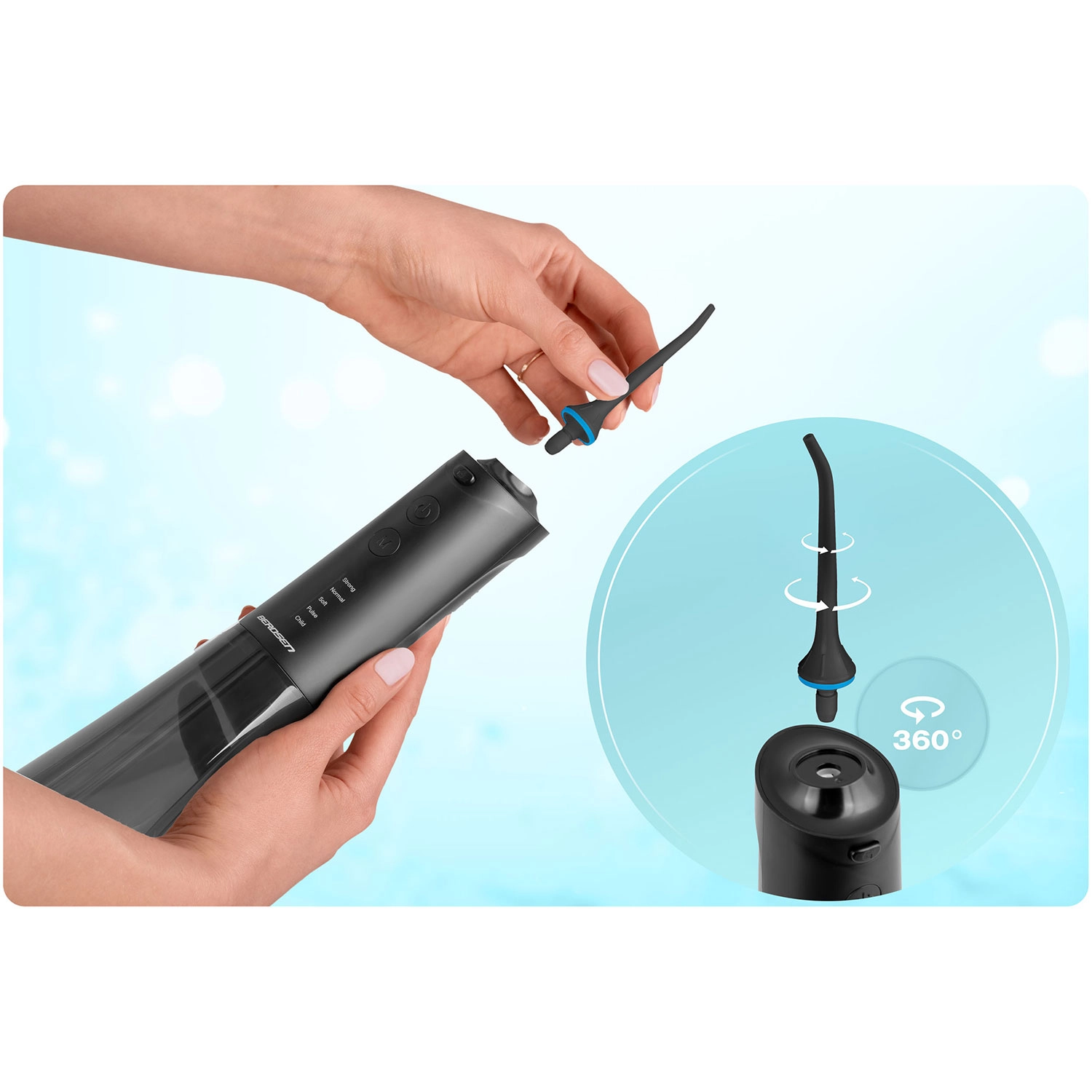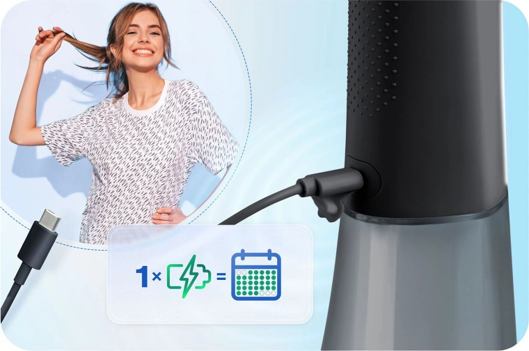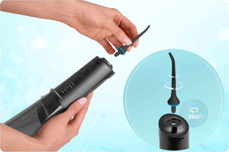 Grâce à la rotation de l’embout à 360°, vous atteignez facilement toutes les zones, et le remplacement des embouts se fait en un instant. La batterie offre environ 30 jours d’autonomie par charge, avec un chargement via USB‑C. L’étanchéité IPX7 garantit une utilisation sûre dans la salle de bain. Un étui de voyage est inclus pour emporter l’hydropulseur en vacances ou en déplacement professionnel.