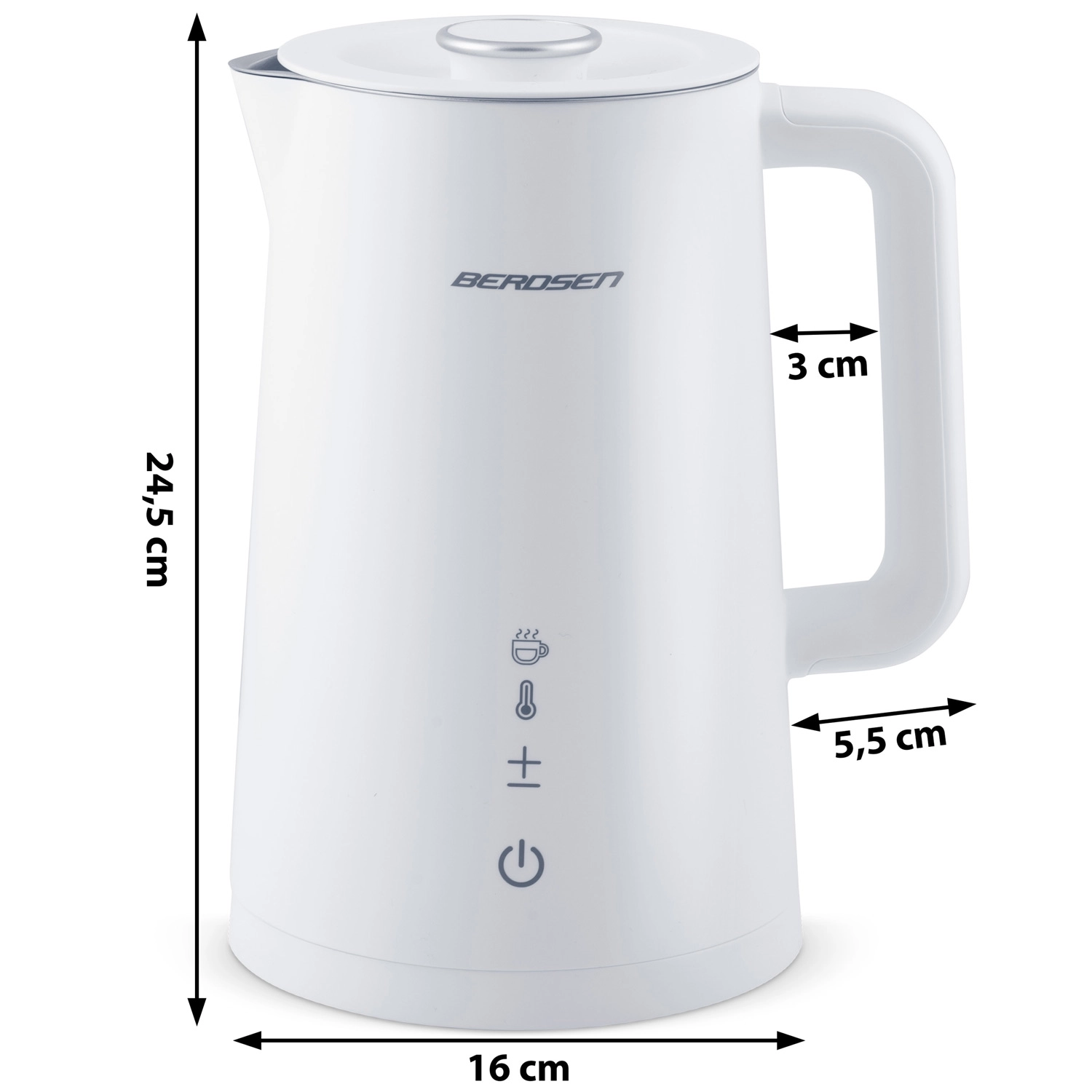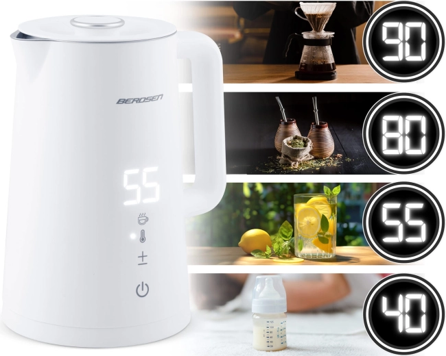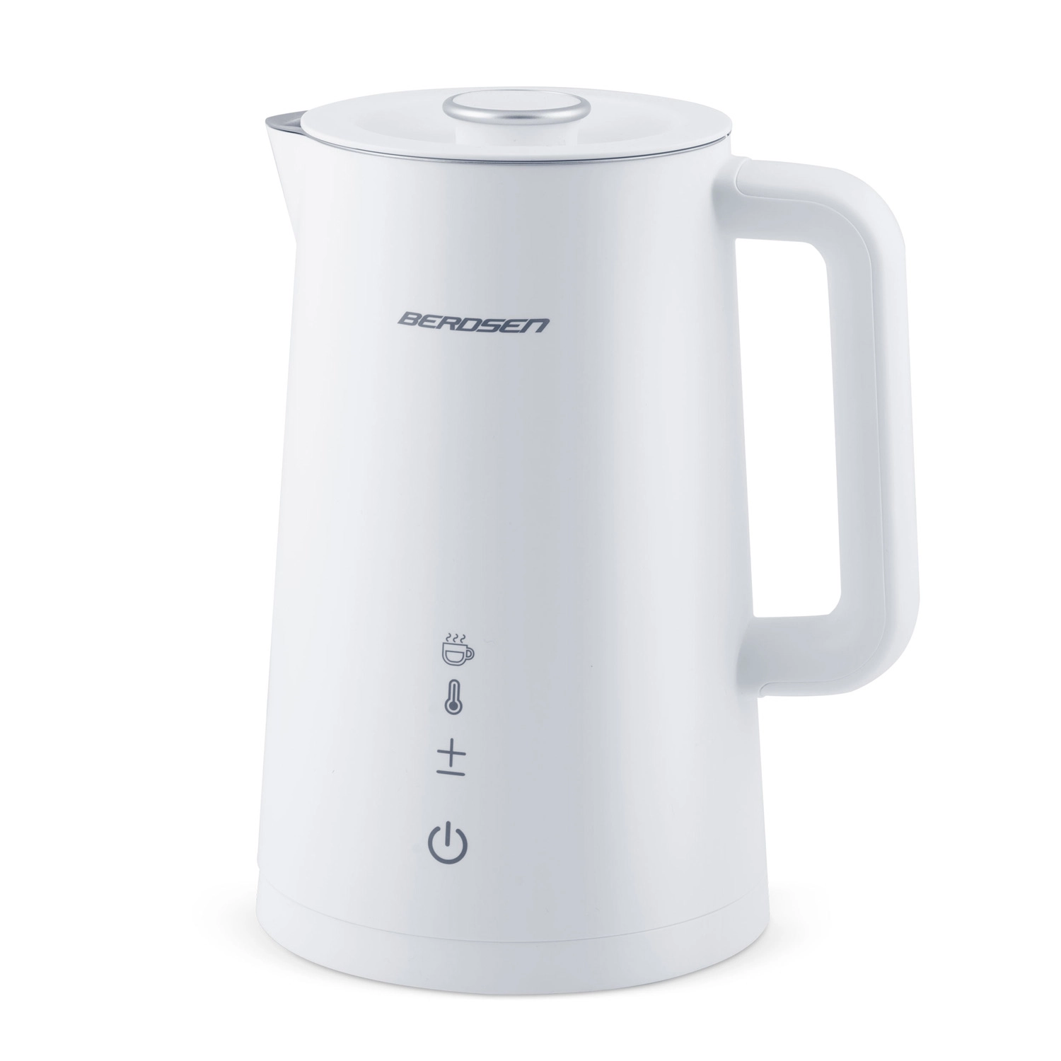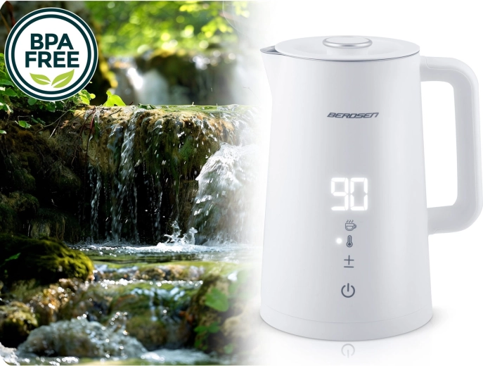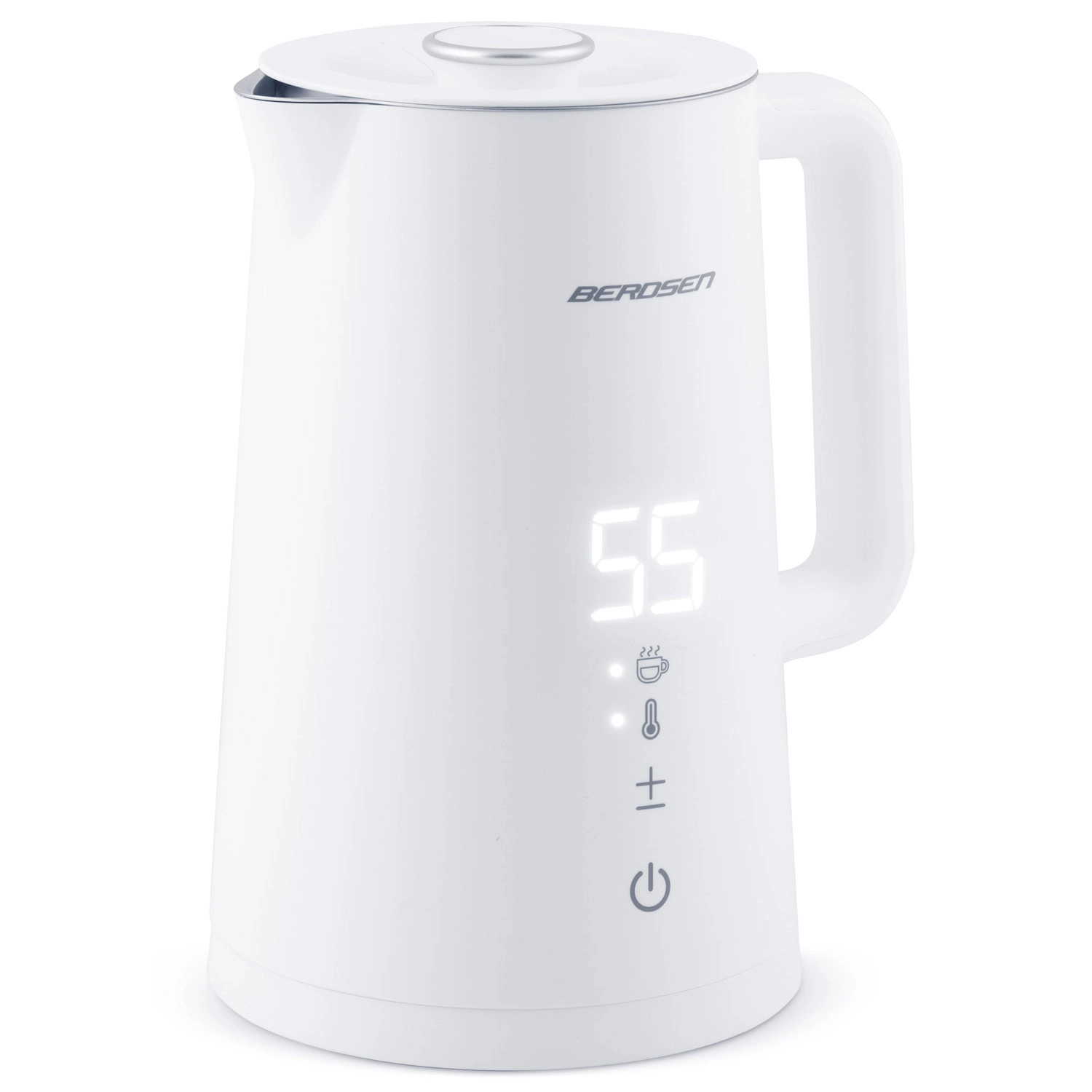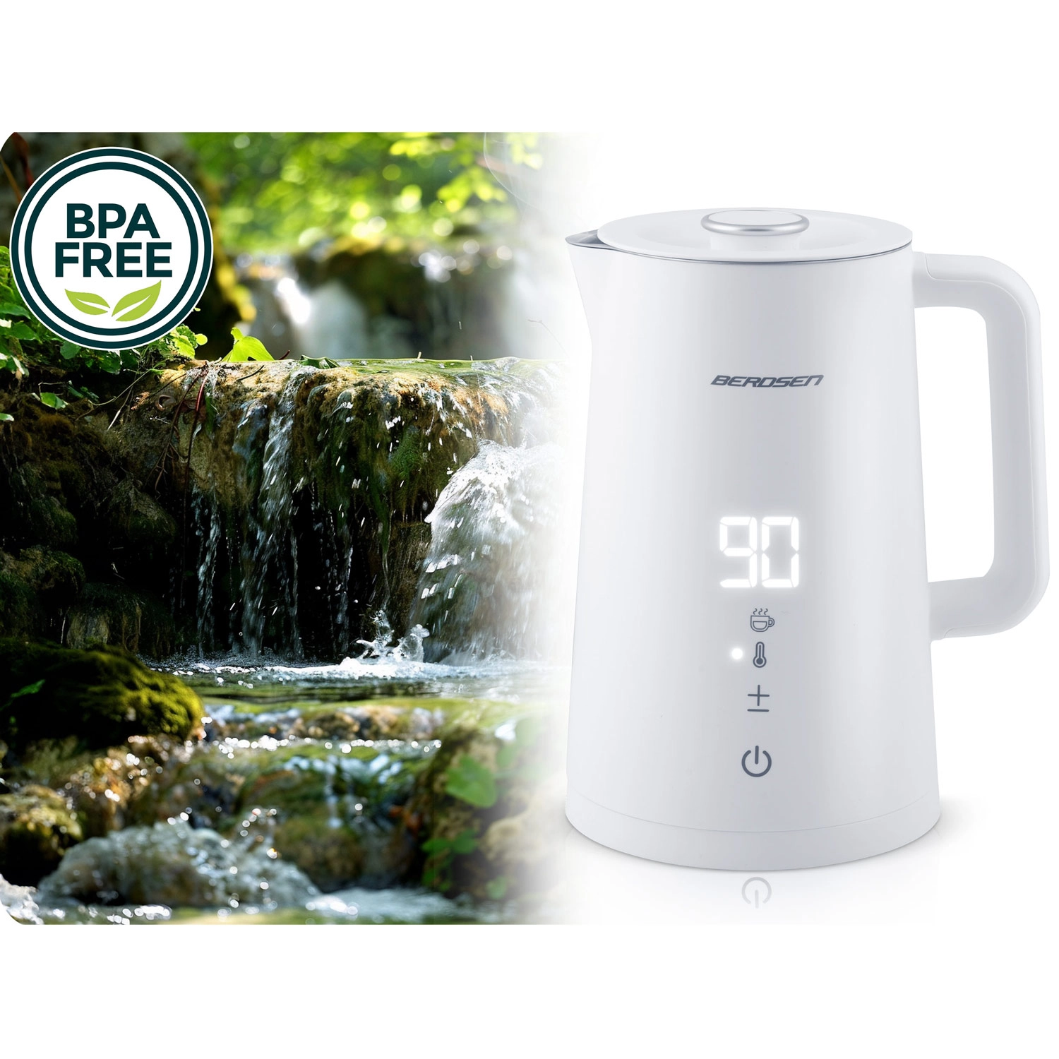 La bouilloire électrique élégante BERDSEN de 1,7 l offre un réglage précis de la température sur 5 niveaux, un panneau tactile avec affichage LED, une fonction de maintien au chaud jusqu’à 2 heures et une construction à double paroi CoolTouch sûre. L’intérieur en acier inoxydable SUS 304 garantit un goût d’eau pur et une longue durée de vie.
