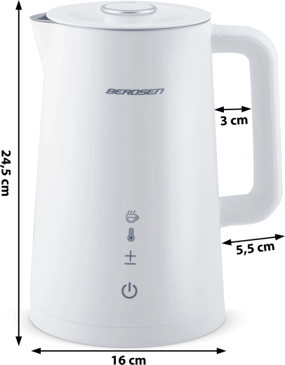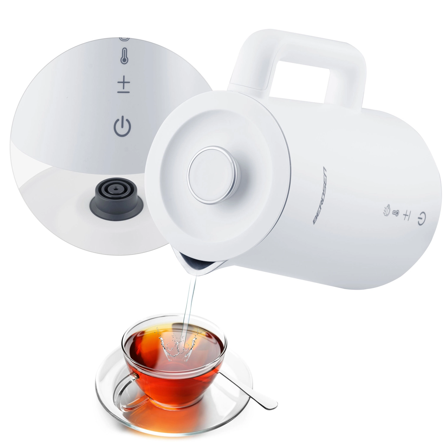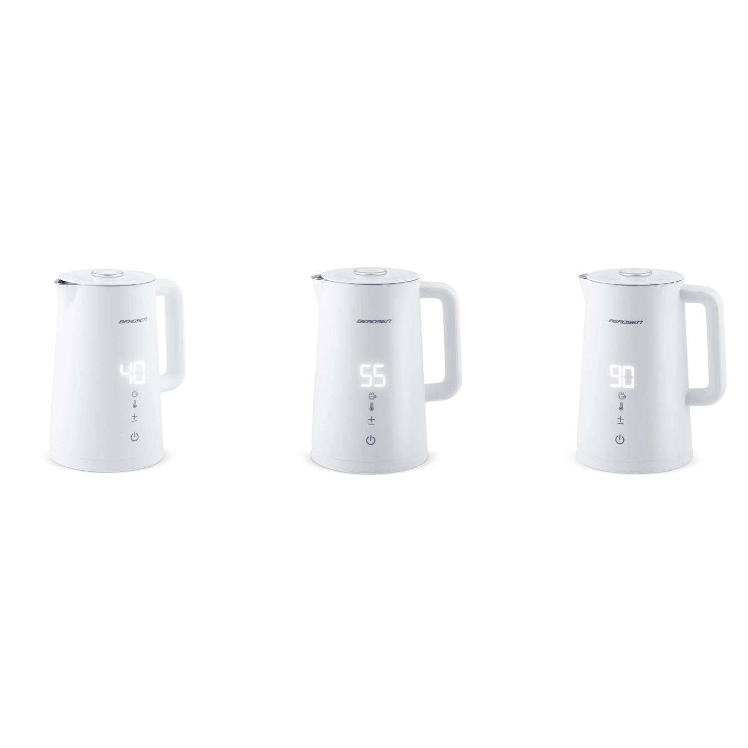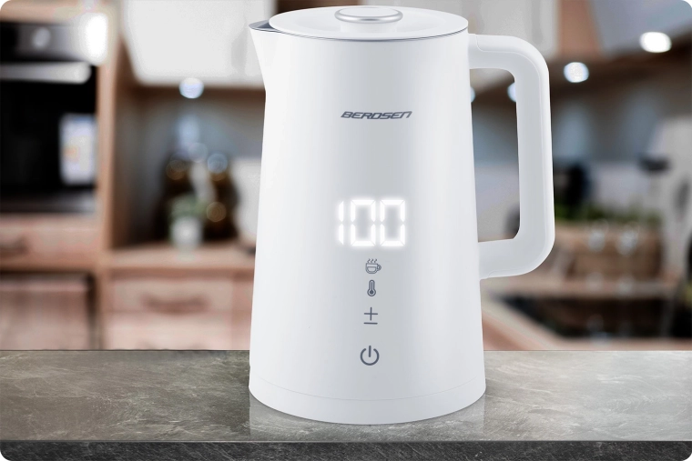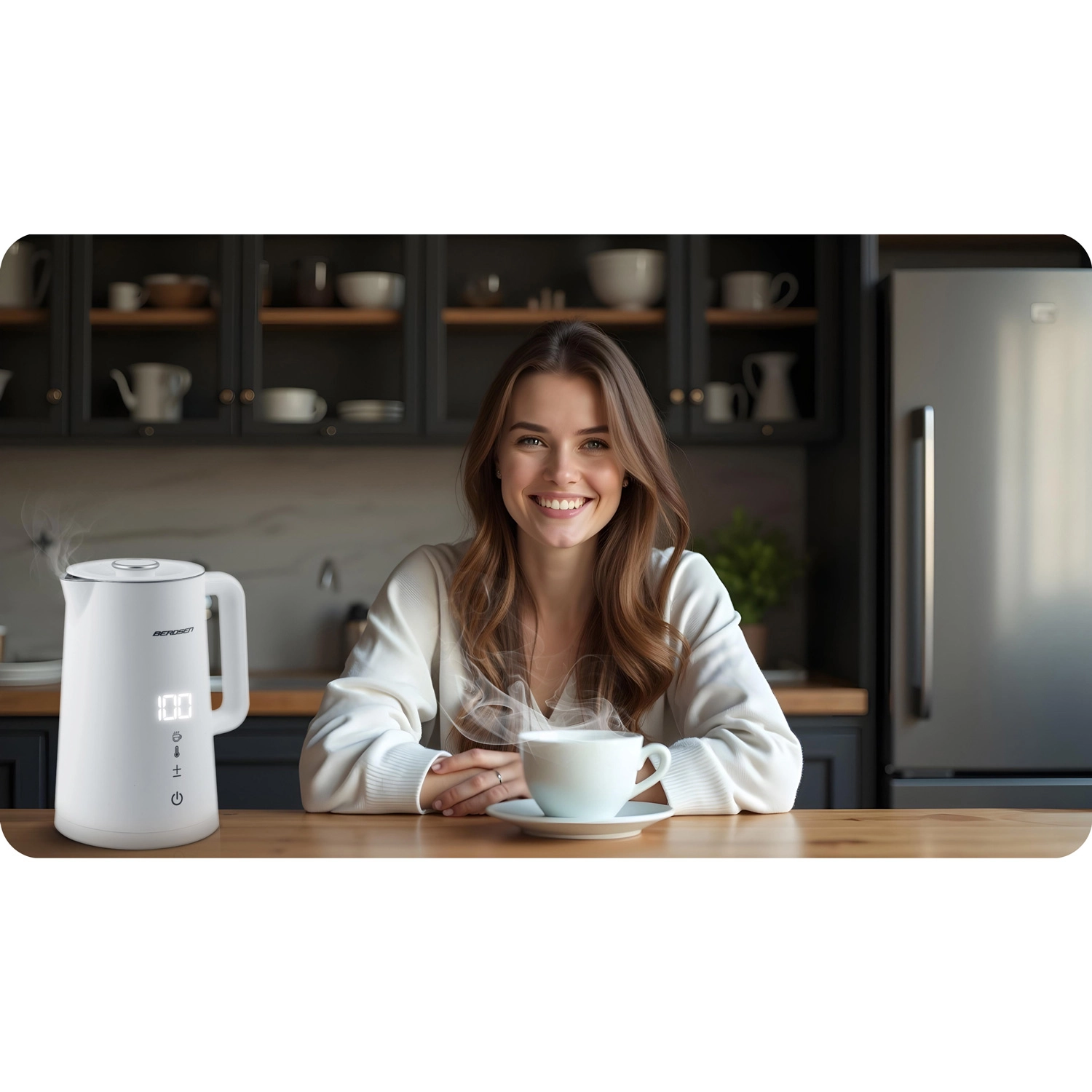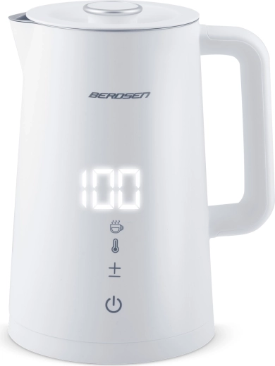 La bouilloire électrique élégante BERDSEN de 1,7 l offre un réglage précis de la température sur 5 niveaux, un panneau tactile avec affichage LED, une fonction de maintien au chaud jusqu’à 2 heures et une construction à double paroi CoolTouch sûre. L’intérieur en acier inoxydable SUS 304 garantit un goût d’eau pur et une longue durée de vie.