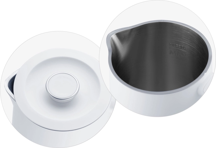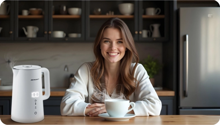 La cuve interne en acier inoxydable SUS 304 (sans BPA) garantit un contact sain avec l’eau, un goût pur et une grande durabilité. La bouilloire est équipée d’un socle rotatif à 360° avec pieds antidérapants et d’un espace pratique pour ranger le câble, ce qui la rend adaptée à toute cuisine.