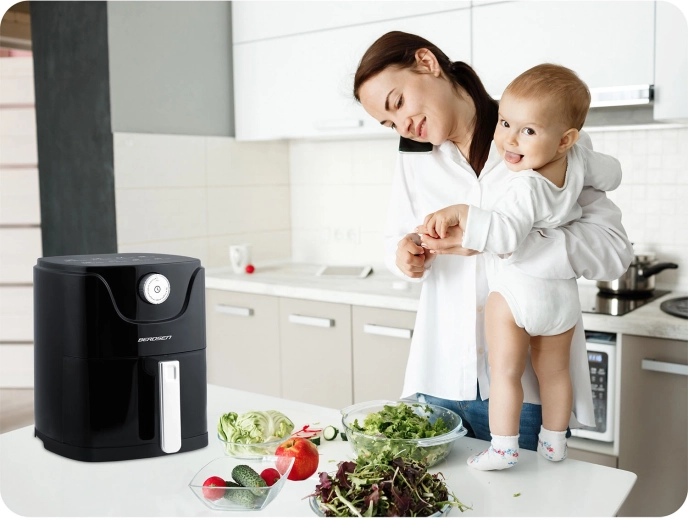 Découvrez la friteuse à air compacte BERDSEN, qui prépare vos plats préférés avec jusqu’à 90 % de matières grasses en moins. Grâce à la circulation d’air chaud, obtenez des frites croustillantes, du poulet juteux et des légumes sans huile et sans salissures. Elle propose 8 programmes préréglés, une capacité de 2,5 l idéale pour des portions familiales rapides et un contrôle simple par bouton rotatif. Entretien facile grâce à son panier amovible compatible lave-vaisselle.