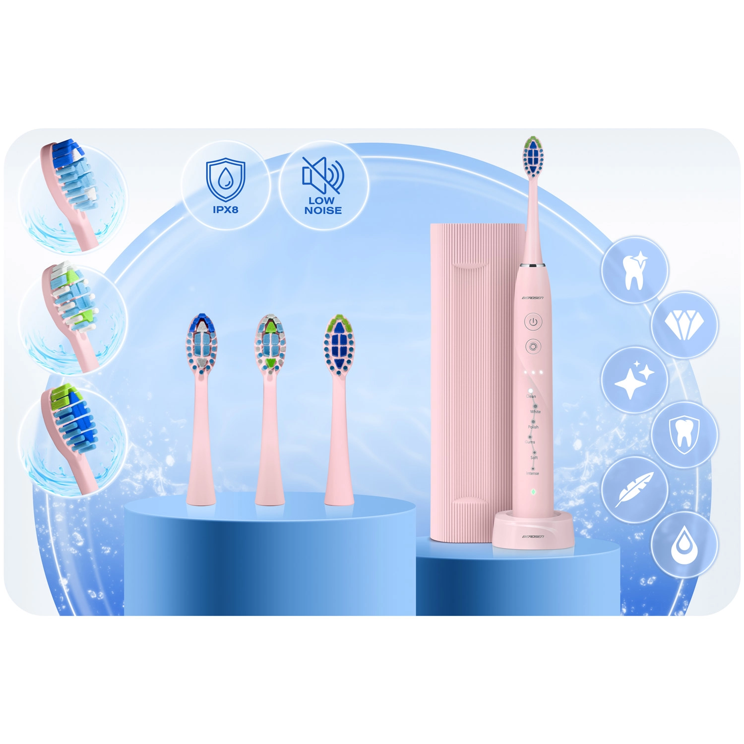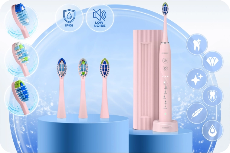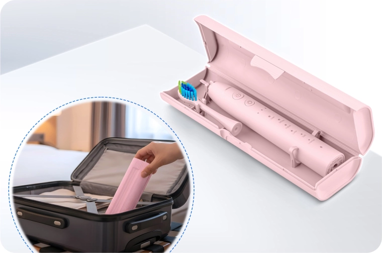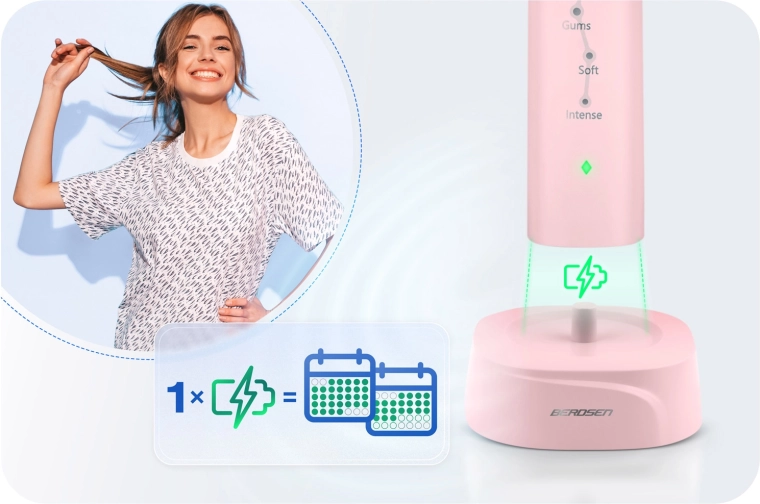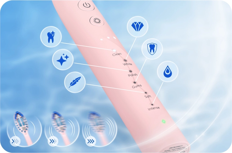 Choisissez parmi 6 modes (Clean, White, Polish, Gums, Soft, Intense) et 3 niveaux d’intensité – soit 18 combinaisons pour une personnalisation maximale. Le minuteur intelligent s’éteint automatiquement au bout de 2 minutes et rappelle de changer de quadrant toutes les 30 secondes. Grâce à une batterie de 800 mAh, à la recharge USB par induction et à la protection IPX8, la brosse est un compagnon fiable à la maison comme en déplacement.