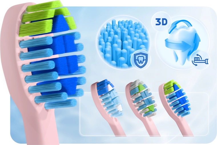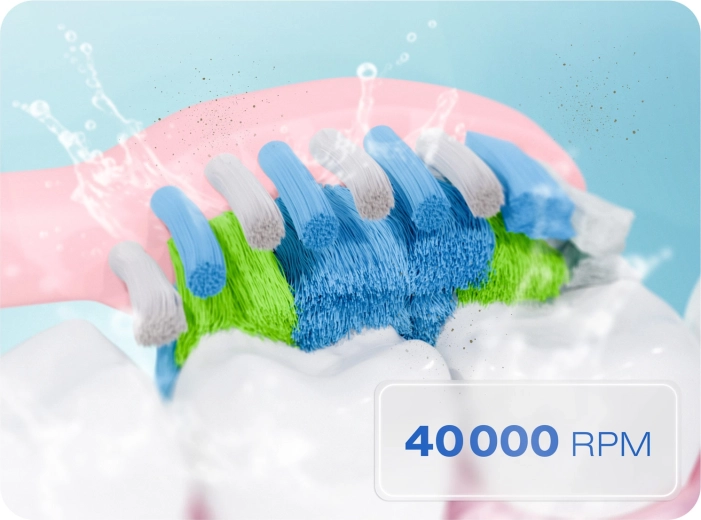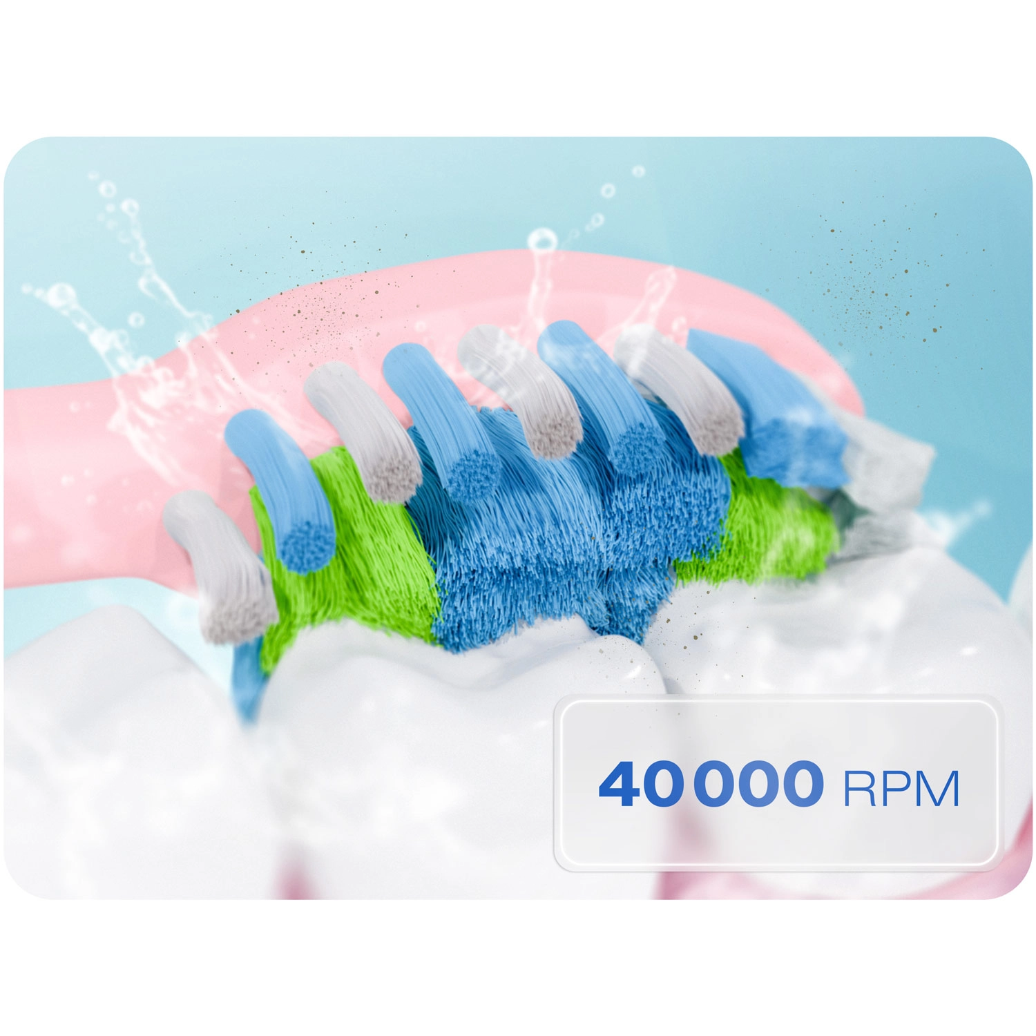 Nettoyage sonique efficace avec jusqu’à 40 000 vibrations par minute, éliminant rapidement la plaque dentaire et les taches, tandis que les poils doux prennent soin de l’émail et des gencives. La tête, avec une disposition innovante des brins, s’adapte à la forme de la dent et l’arrière sert de nettoyeur de langue pour une haleine fraîche durable.