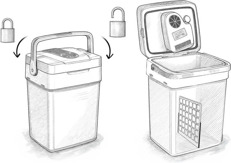 • Transport sécurisé – la poignée verrouille le couvercle en position fermée.