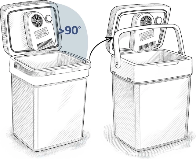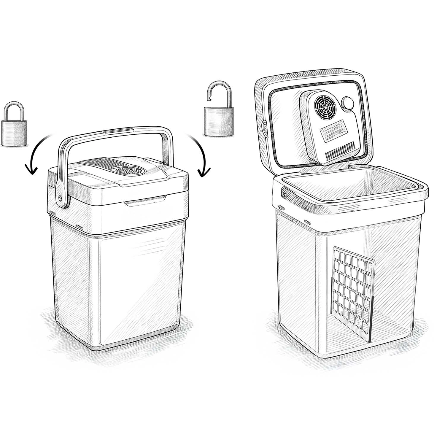 Elle refroidit jusqu’à 18 °C en dessous de la température ambiante et, en mode chauffage, maintient les plats jusqu’à 65 °C. La poignée pliante sert aussi de support de couvercle, le verrou lorsque la poignée est en position verticale empêche toute ouverture involontaire lors du transport, et la cloison intérieure aide à organiser le contenu. En mode ECO, vous apprécierez son fonctionnement extrêmement silencieux (26 dB), qui ne dérange pas même la nuit.