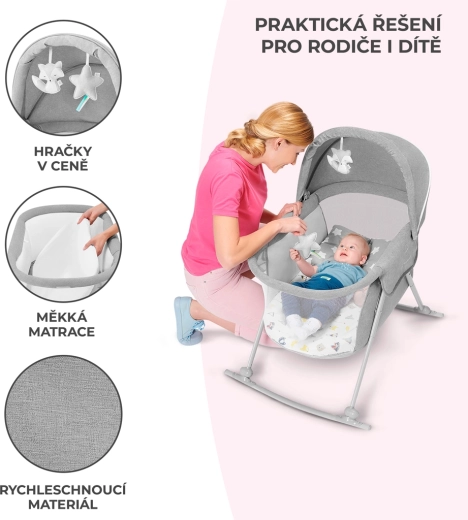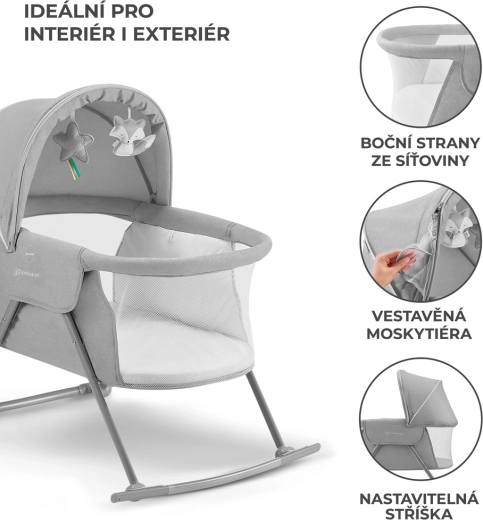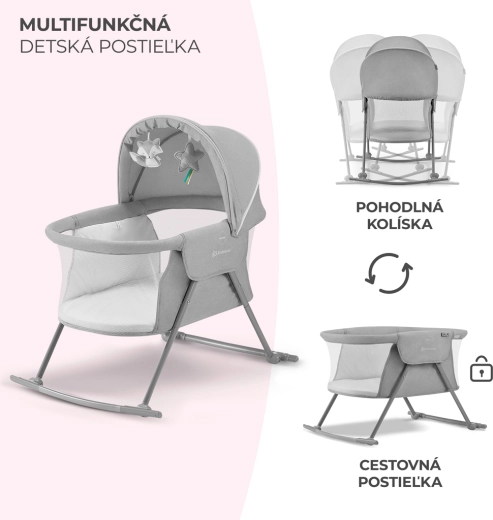 Le lit bébé pratique 3-en-1 KINDERKRAFT Lovi sert de lit, de berceau et de lit de voyage. Il est léger et compact, avec un pliage rapide sans outils, une fonction de balancement, une capote amovible avec moustiquaire intégrée et des côtés en maille respirante pour un sommeil sûr et confortable dès la naissance jusqu’à 9 kg.