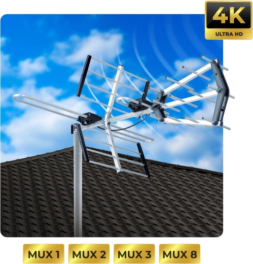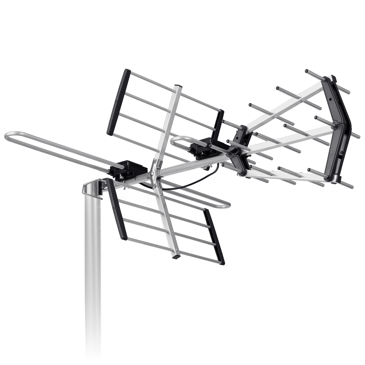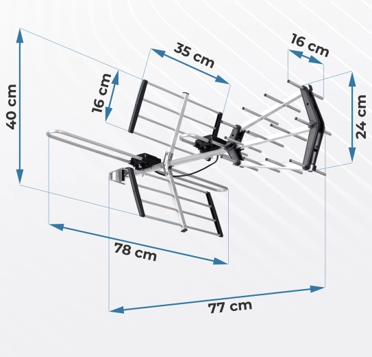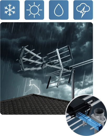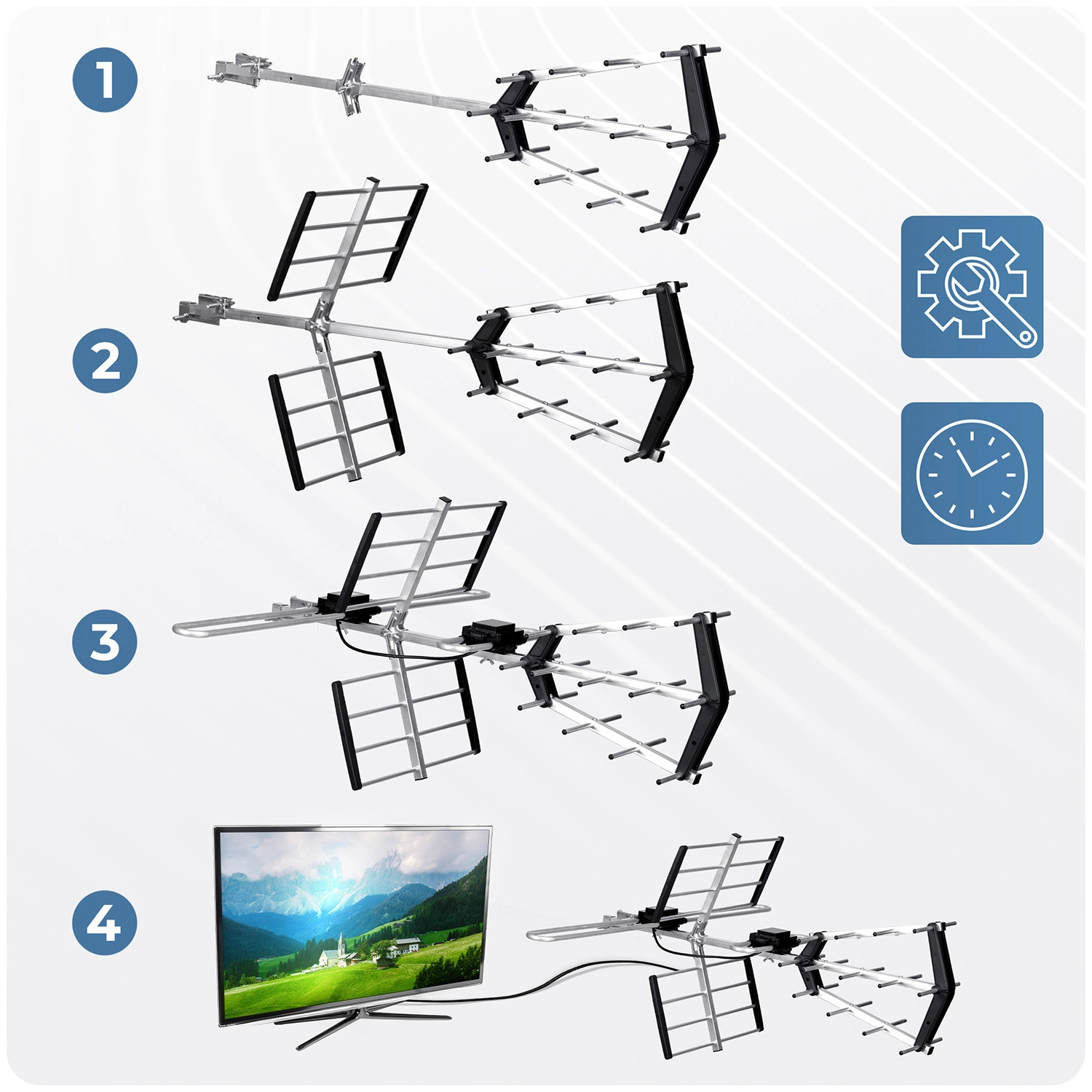 Sa construction robuste et résistante aux intempéries, dotée de réflecteurs et de directeurs directionnels, assure une réception fiable par vent, pluie ou gel. Le filtre LTE intégré réduit efficacement les interférences des réseaux 4G/5G pour un signal propre. L’installation facile, sans outils spéciaux, permet une mise en service rapide en quelques minutes.