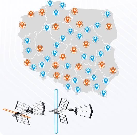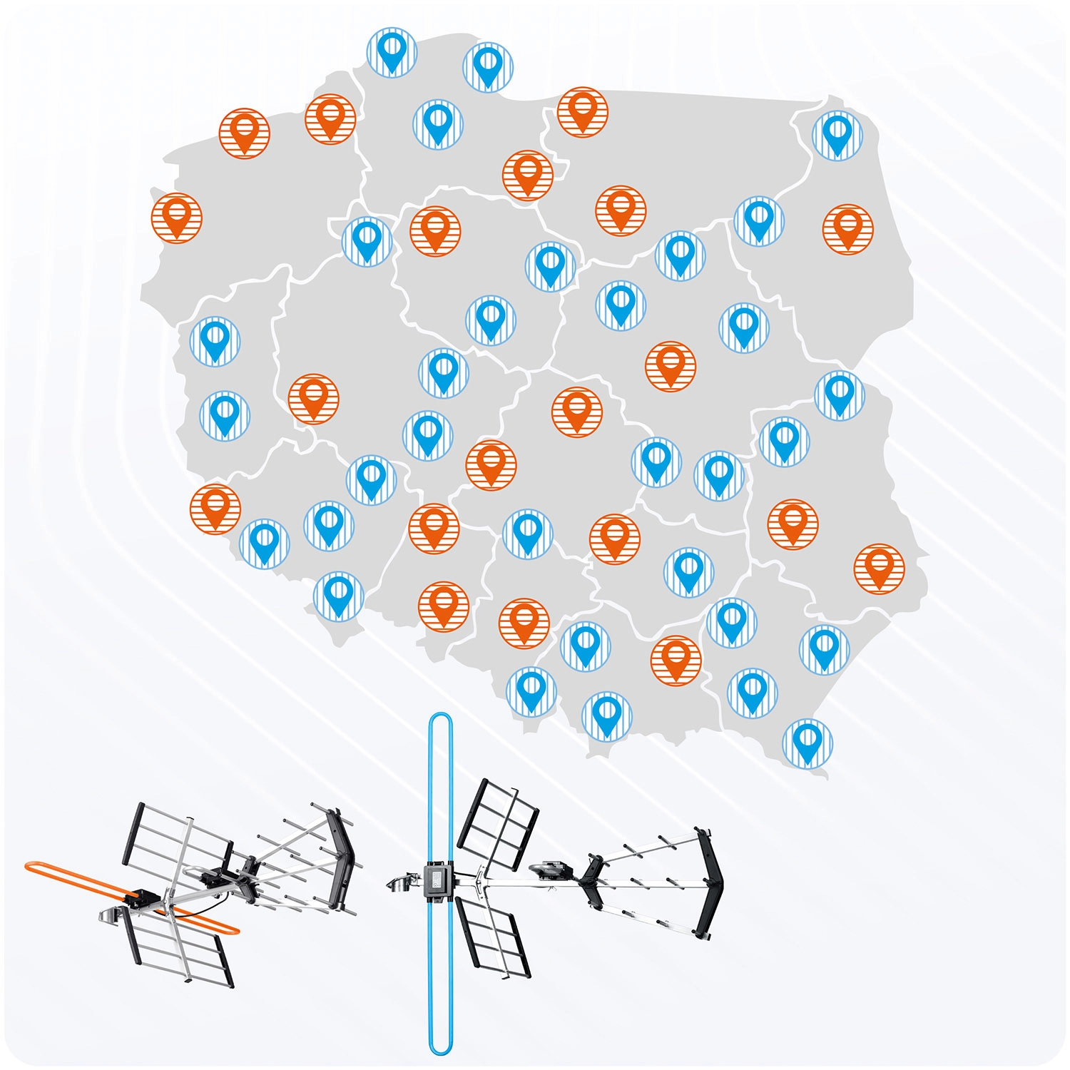 - VHF/UHF – couverture de tous les multiplexes MUX 1–8.