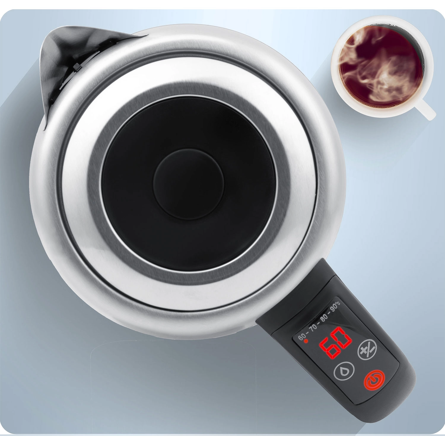 Sélectionnez 60/70/80/90/100 °C ou affinez par paliers de 5 °C à l’aide des touches +/– sur la poignée. Idéal pour le thé vert, le café et les boissons pour enfants.