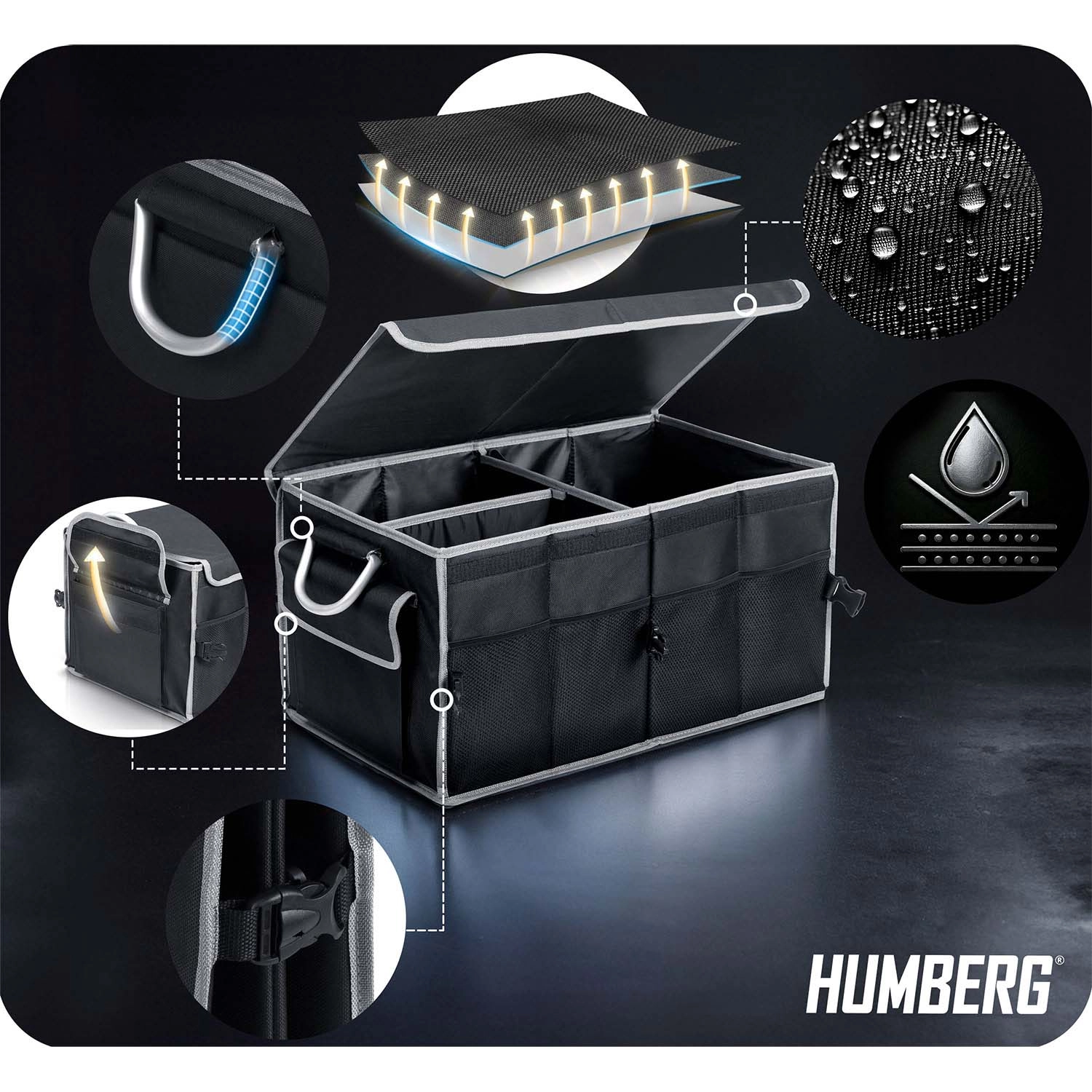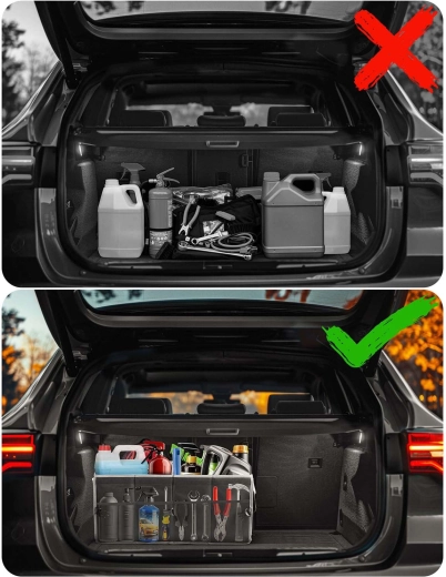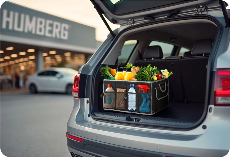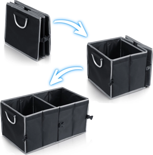 Transformez le chaos en un espace parfaitement organisé. L’organisateur de coffre HUMBERG est conçu pour un usage quotidien – pour les courses, les outils, les câbles, les produits d’entretien auto et même la trousse de secours. Sa construction modulaire permet d’utiliser un ou deux compartiments, ou de plier complètement l’organisateur à plat lorsque vous n’en avez pas besoin. Le couvercle rabattable et amovible dissimule discrètement le contenu et le protège de la poussière et du soleil.