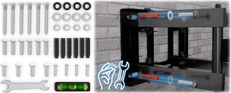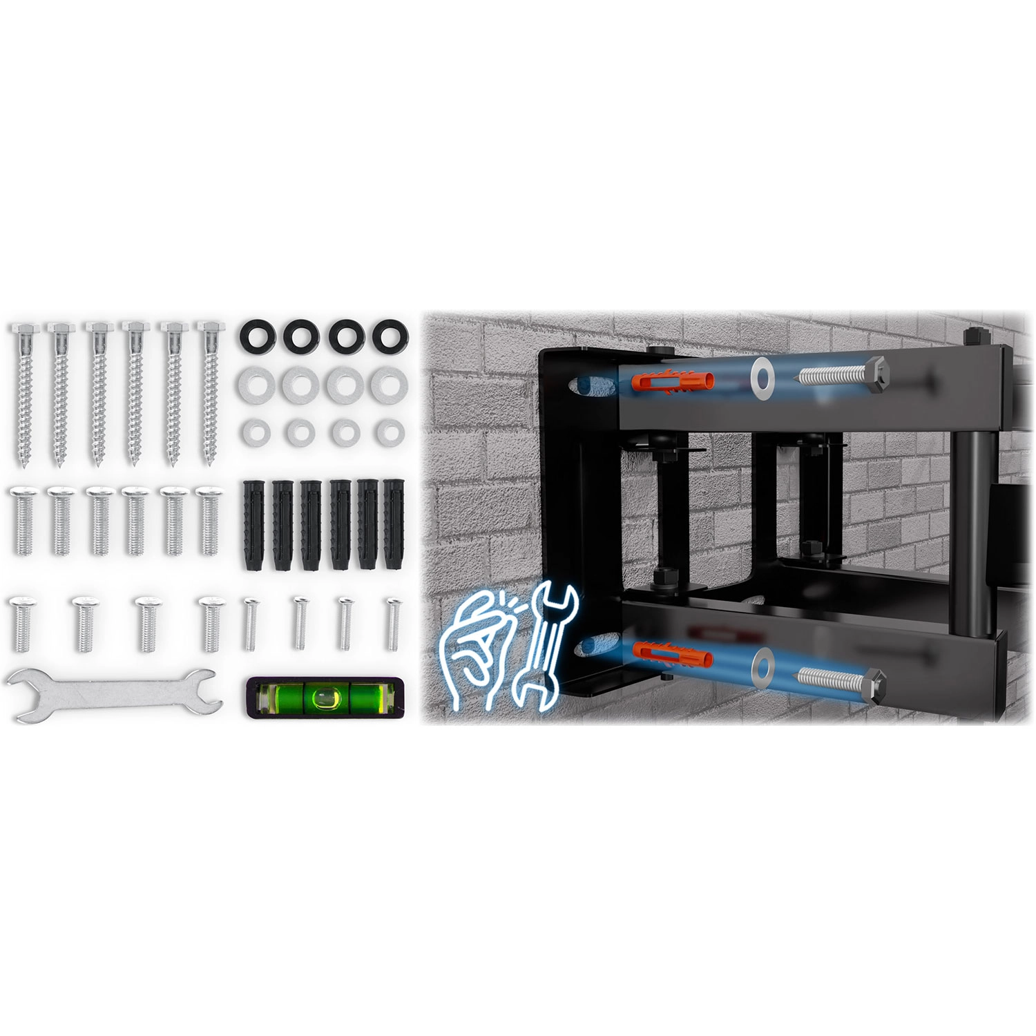 L’installation est rapide et intuitive. L’emballage contient tout le nécessaire, y compris vis, chevilles, rondelles, clé et mini-niveau pour un alignement parfait. Le support prend en charge la norme VESA 75×75 à 400×400 et est compatible avec un large éventail de téléviseurs.